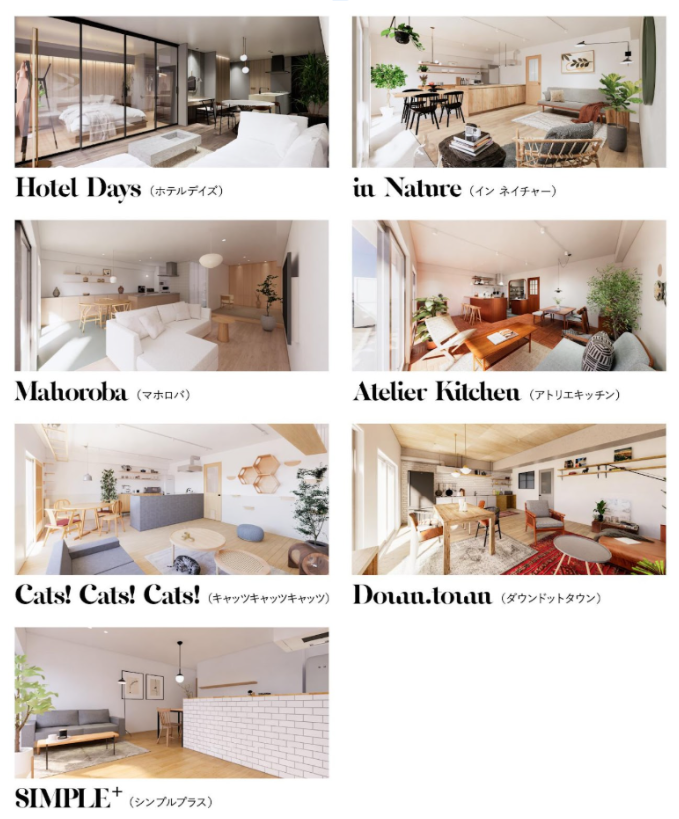「ライフカタログ」は、価格や手間を抑えながら、自分好みの住まいやコーディネートを気軽に実現することができる定額リノベ-ションパッケージです。ツクルバが提供する中古・リノベーション住宅の流通プラットフォーム「cowcamo(カウカモ)」を利用した物件購入に合わせて、オリジナルの内装デザイン全7種類の中からお好みの1つを選択することができます。