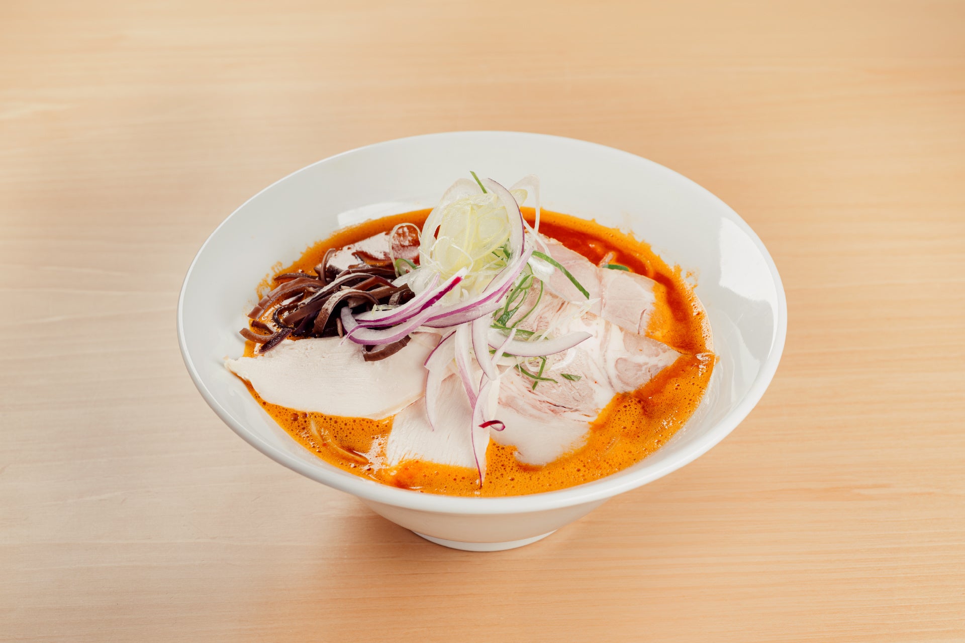 鶏白湯スープにラー油、七味、豆板醤を加えて旨辛に仕上げました。鶏白湯のコクと唐辛子の刺激がクセになる一杯です。辛さは4段階からお好みに合わせてお選びいただけます。
