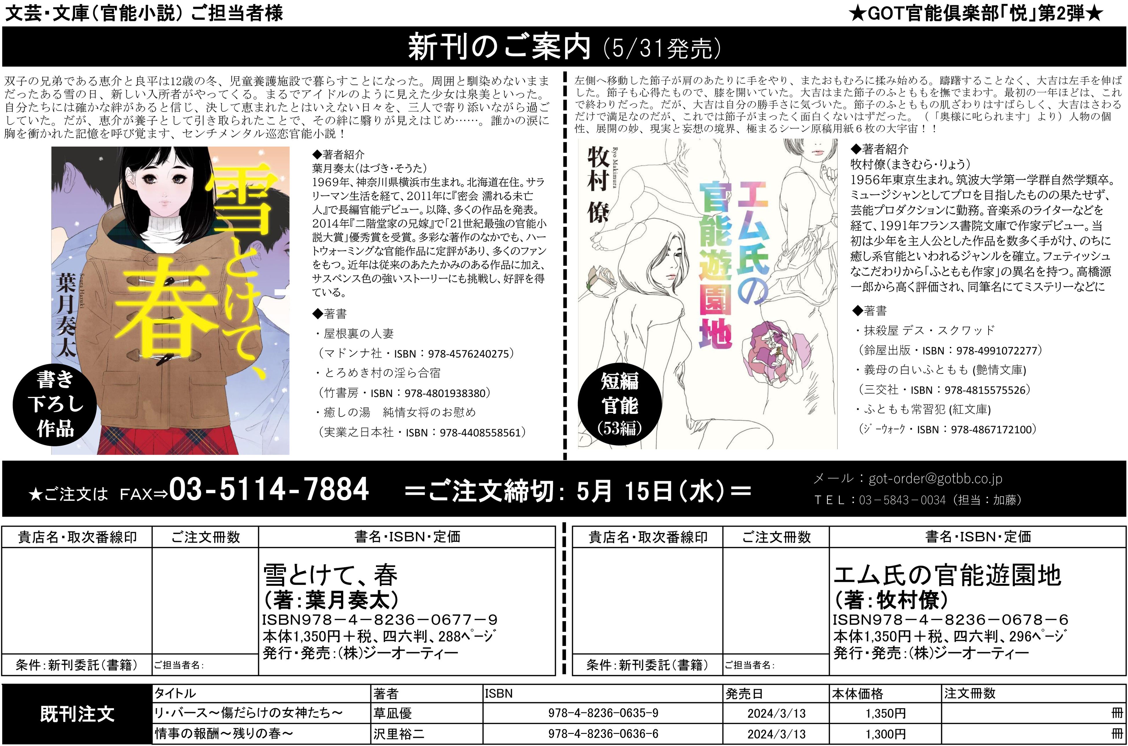 GOT官能倶楽部「悦」第2弾!2024年5月31日発売『雪とけて、春』(著:葉月奏太)・『エム氏の官能遊園地』(著:牧村僚)株式会社ジーオーティー2024年4月18日 17時00分いいね!数を読み込み中です株式会社ジーオーティー(本社:東京都港区、代表取締役:吉永敦仁)は、書籍レーベル・GOT官能倶楽部「悦」の第2弾となる2作品を発表し、書店からの事前注文を開始いたします。 ・2024年5月31日発売 『雪とけて、春』(著:葉月奏太) ISNB:9784823606779 『エム氏の官能遊園地』(著:牧村僚) ISBN:9784823606786すべての画像種類商品サービスビジネスカテゴリ雑誌・本・出版物キーワード文芸小説官能葉月奏太牧村僚ダウンロードプレスリリース素材このプレスリリース内で使われている画像ファイルがダウンロードできます