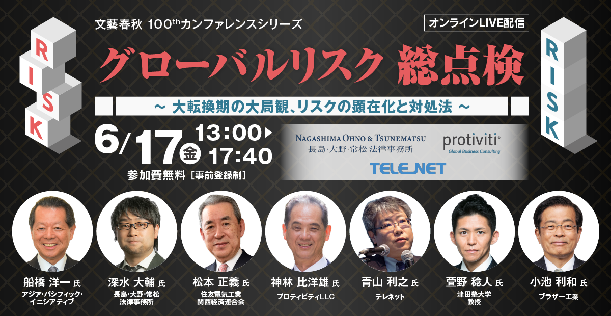 株式会社文藝春秋(本社:東京都千代田区 代表取締役社長:中部嘉人)は6月17日(金)、「グローバルリスク総点検」をテーマにカンファレンスを開催します。本カンファレンスでは、地政学リスク、気候変動リスク、サイバーリスク、ファイナンスリスク、デジタルリスク、法務・労務リスク、サプライチェーンリスクなど、さまざまな経営課題に対応するためのリスクマネジメントの現在地を考察し、プロフェッショナルの講演を通じ、未来を見据えた事業運営の在り方について検証をします。是非ともご参加のほどよろしくお願い申し上げます。