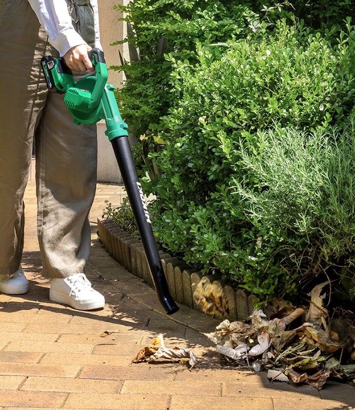 今回発売するRB 18DC(BCL)は、18Vのコードレスブロワです。ガーデンノズルを搭載したことにより、立ったまま楽な姿勢で足元のゴミや落ち葉を吹き飛ばせます。さらに、風路構造の最適化によりクラストップ※1の大風量を実現しています。また、スイッチを最大に引いたときの風量を強・中・弱の3 段階に調整できる風量調整機能と、トリガーの引き加減に応じて風量を調整できる無段変速スイッチで、用途やシーンに応じ風量を自在に調整することができます。
