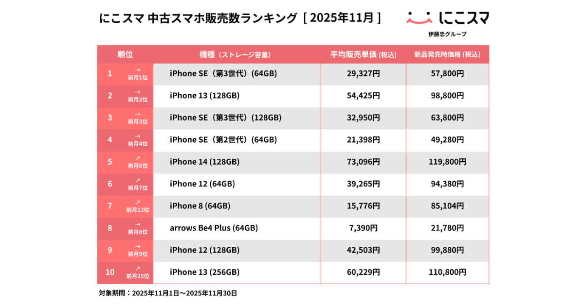 2025年11月の販売数ランキングでは、iPhone SE(第3世代)(64GB)が6か月連続で1位にランクインしました。