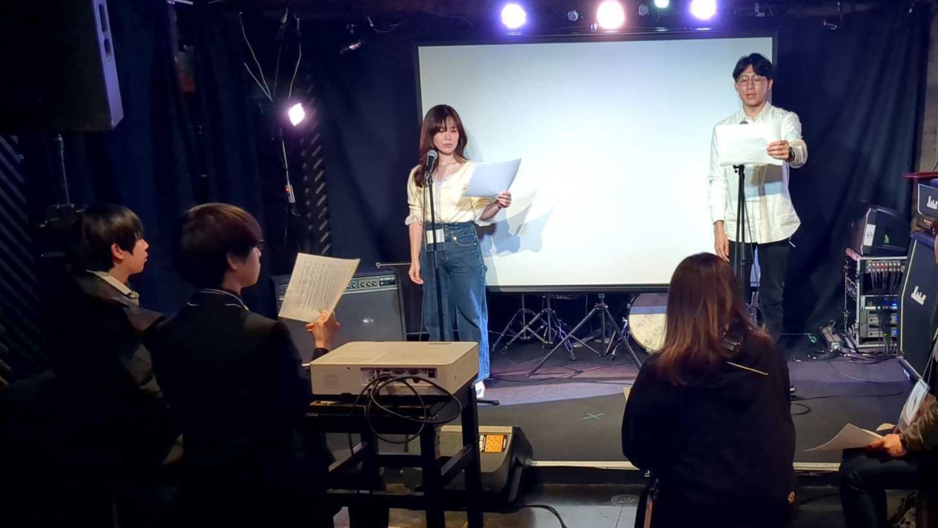 体験会ではボイスプラネットでボイストレーニングの講師を務めていただいている高倉氏をお招きし、二人一組での掛け合い演技を行いました。俳優や声優に演出家、劇作家などマルチに活躍される高倉講師からは発声などの技術的なことに加え、掛け合い演技とナレーションの違い、演技における気持ちの重要性、収録現場でのマイクの高さなど、実際の現場で活躍されているからこそわかる生きた指導をしていただきました。掛け合いの演技では、まずお互いが台本に目を通して感じたままに演技を披露しました。その演技を聴いた高倉講師が感じた点や改善点をフィードバック。参加者はいただいたフィードバックをもとに演技プランを再考します。ここではどのペアも自発的にお互いどう演じるべきかを話し合っており、臨んだ二回目の演技は、どの参加者も一回目より格段に上達しており、レッスンの効果を実感し、演技の楽しさを味わえる体験会となりました。