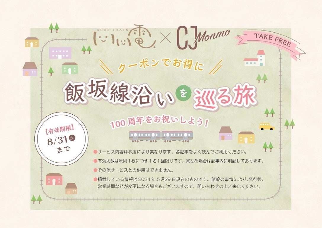 この度、福島のタウン情報誌「CJ Monmo」(発行:株式会社エス・シー・シー)は、飯坂線開通100周年に合わせて、グルメを中心に福島市内のスポット28店舗のオトクなクーポンを付けたフリーペーパー『クーポンでお得に 飯坂線沿いを巡る旅』を制作いたしました。