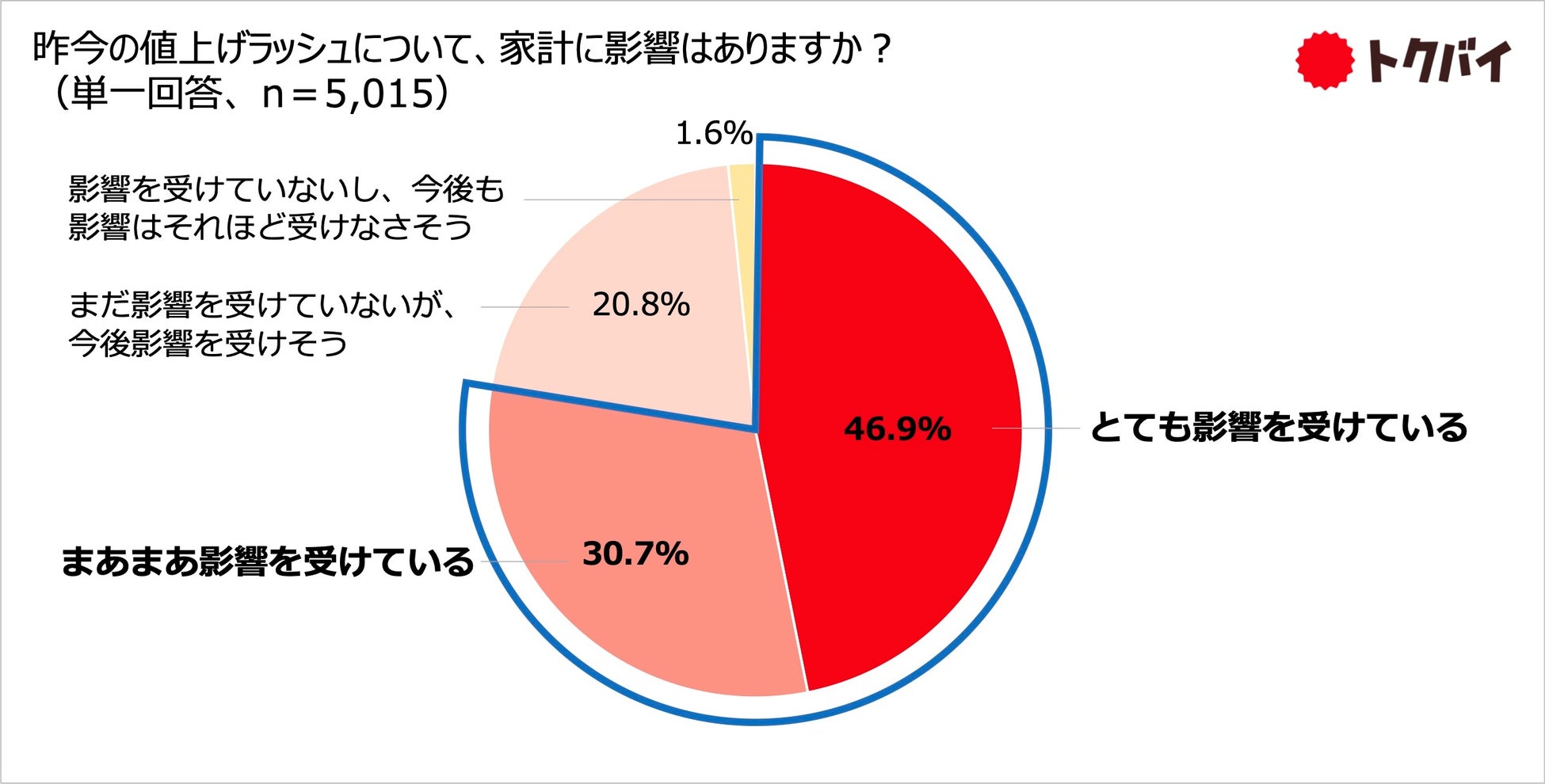 家計への影響についてたずねたところ、「とても影響を受けている」との回答が46.9%、「まあまあ影響を受けている」が30.7%となり、合計で約8割に上りました。さらに、「まだ影響を受けていないが、今後影響を受けそう」との回答が20.8%となりました。