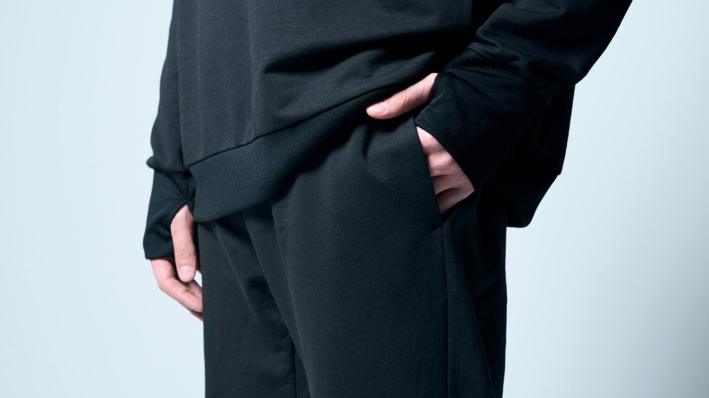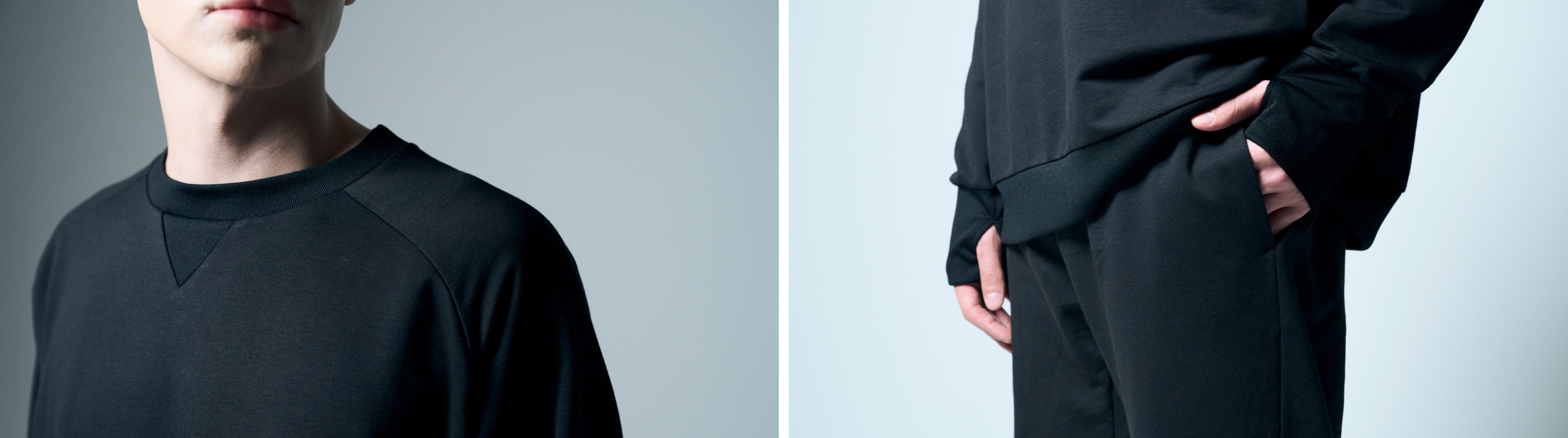 吸水性のあるコットンと吸湿性の高いレーヨンを、丈夫で速乾性のあるポリエステルと交編したオリジナル生地です。しわになりにくく、優しい触感の肌面パイル地に仕上げています。また、生地の重量は6.8オンスと一般的なスウェット生地の9~13オンスと比較して軽量生地であるため、睡眠中の寝返りの負担も軽減します。