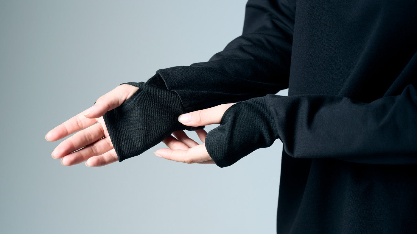 トップスは、指穴付きで寒い時には手まで覆うことが出来ます。パンツは、調整ストッパー付きで暑い時には裾の長さを調整出来ます。