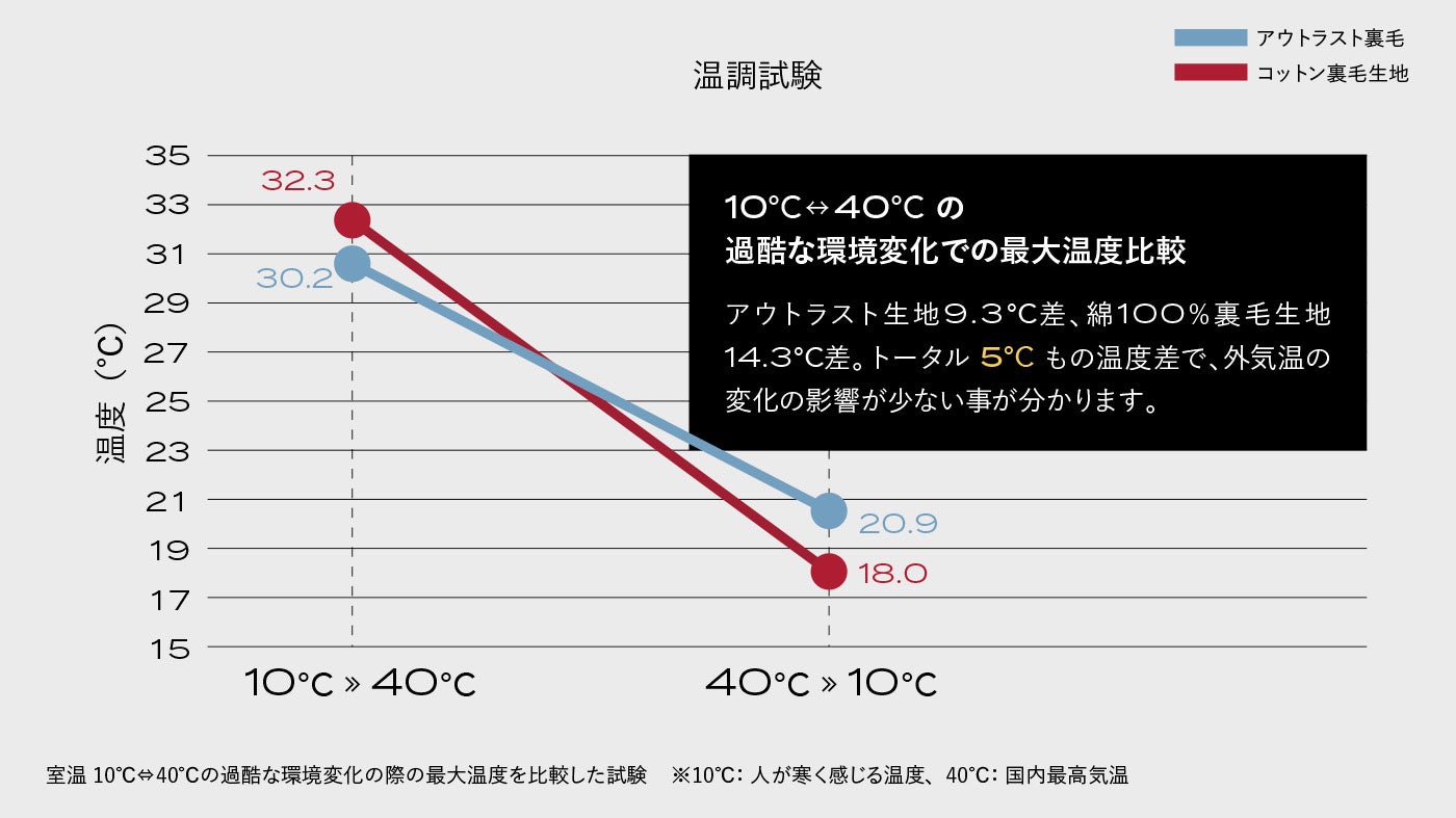 コットン裏毛生地と比較して温度をさらに5℃調整し、室温の変化による影響を最大限減少させます。