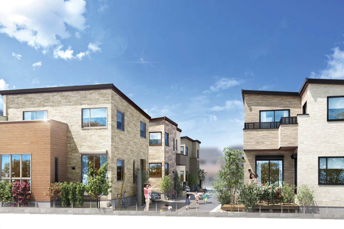 当分譲地は住人以外の通り抜けのない街区内道路を設けました。子どもが遊んだり、街の住人同士で交流を深める開放的なコミュニティ街区です。また隣接する公園の緑や街の中の自然と調和するよう木調の素材を取り入れた邸宅デザインを施し、自然の心地よさに包まれて暮らせる街を描きました。緑の潤いや伸びやかな開放感を日常的に味わうことができるよう街並みや住まいをプランニングしました。