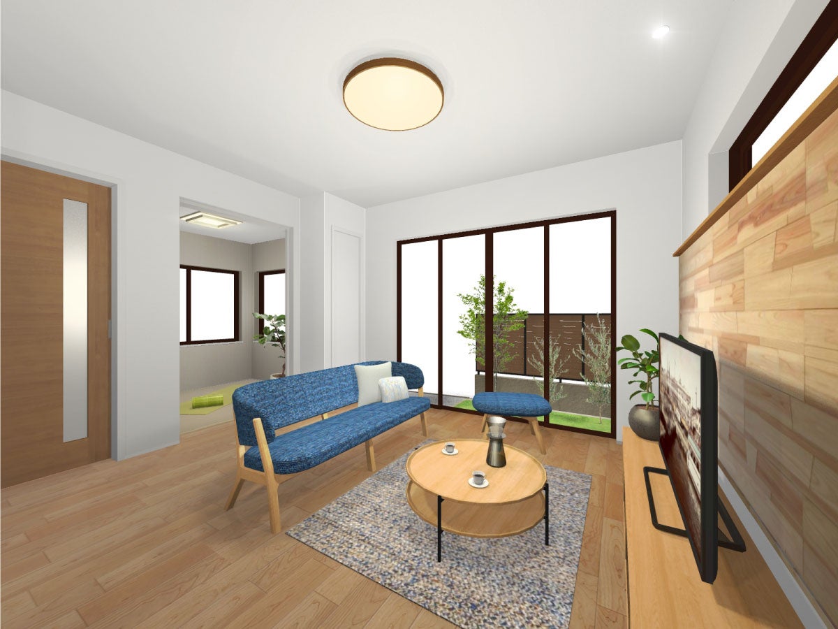 リビングの続き間に弾力性のあるテキスタイルフロアを敷いた空間を設け、リビングの掃き出し窓には4枚建てのワイドサッシを採用。庭と繋がり、庭の緑を借景にゆったりとくつろげます。