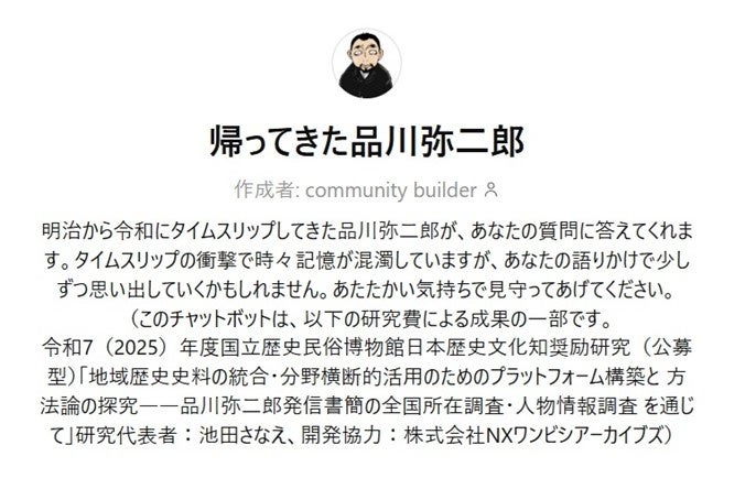 NIPPON EXPRESSホールディングス株式会社のグループ会社でデータ・ソリューション事業を展開している株式会社NXワンビシアーカイブズ(本社:東京都港区 代表取締役社長 高橋 豊)は、京都府立大学 文学部歴史学科(以下「京都府立大学」)池田さなえ准教授と共同で、幕末から明治期に活躍した官僚・政治家「品川弥二郎」に関する対話型AI(カスタムGPT)を試作しました。本取り組みは、貴重な歴史史料や研究論文の知見について、歴史学以外の専門家、一般の方も気軽にアクセスできる環境を整えることを目的としています。本チャットボットは、(1)歴史学の研究成果を他分野でも活用できる方法、(2)一般への利活用を想定した歴史的人物(歴史史料)への親しみやすさの向上、(3)歴史研究者による技術面、コスト面を踏まえた持続可能な取り組み、の3点を検討しています。