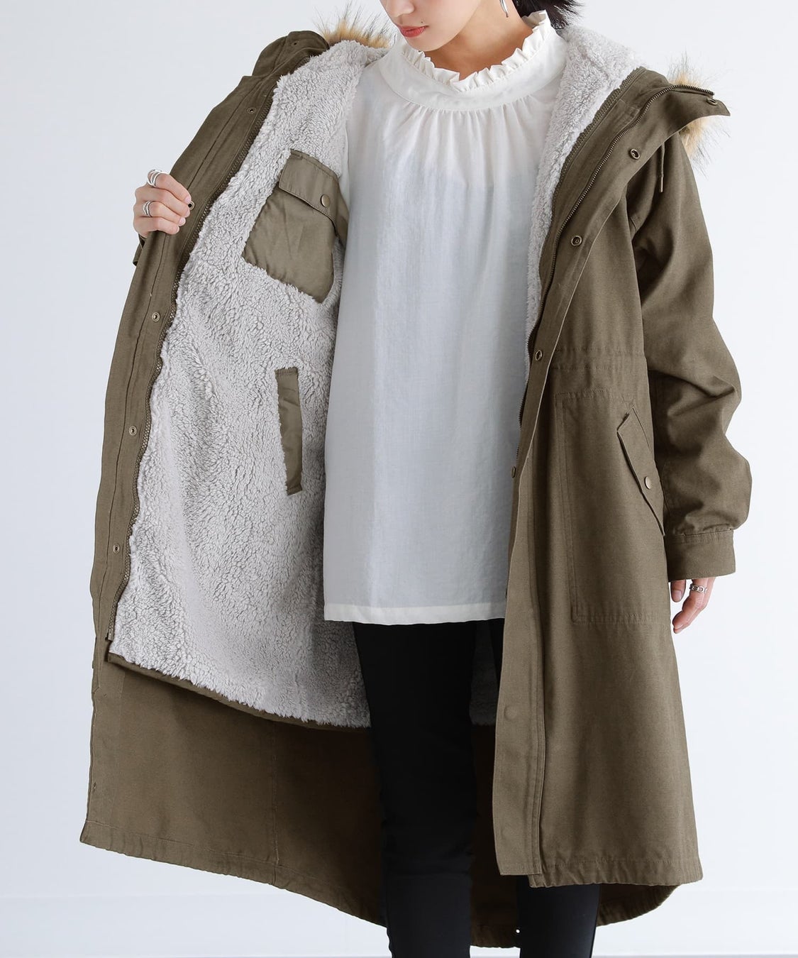ライナー付きの暖かなモッズコートとして、ライナーを外してライトアウターとして、そしてライナー単体でボアコートとして。一枚で3つの顔を持つお洒落なコートです。また、フードのファーも取り外し可能で、その日の気温や気分に合わせて着こなしの幅が広がります。