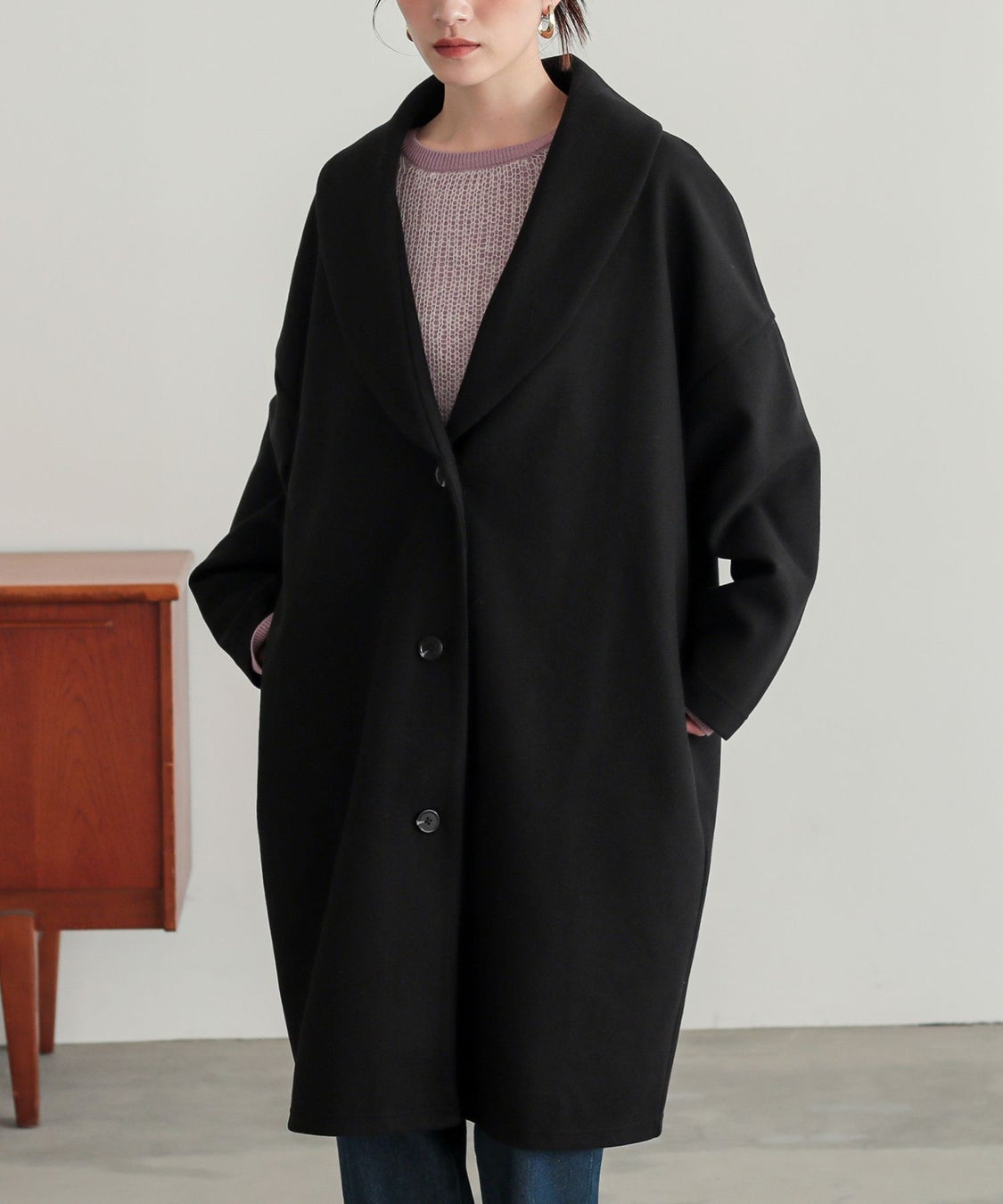 軽量で使いやすい裏地なしのウールライクコート。首回りが華やかに見えるショールカラーや、羽織るだけでこなれ感が出るコクーンシルエットが、トレンド感を演出します。シンプルデザインのため、どんなコーディネートにも合わせやすくデイリー使いにピッタリです。
