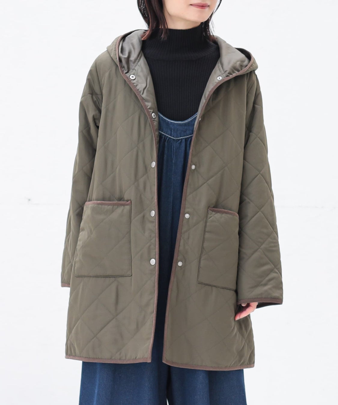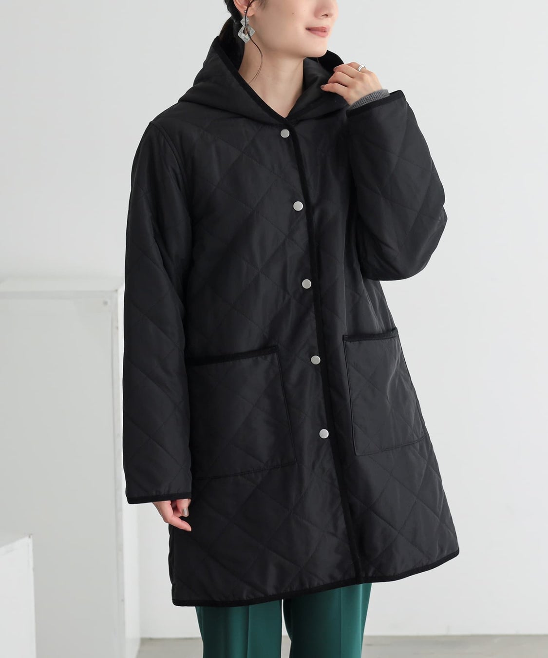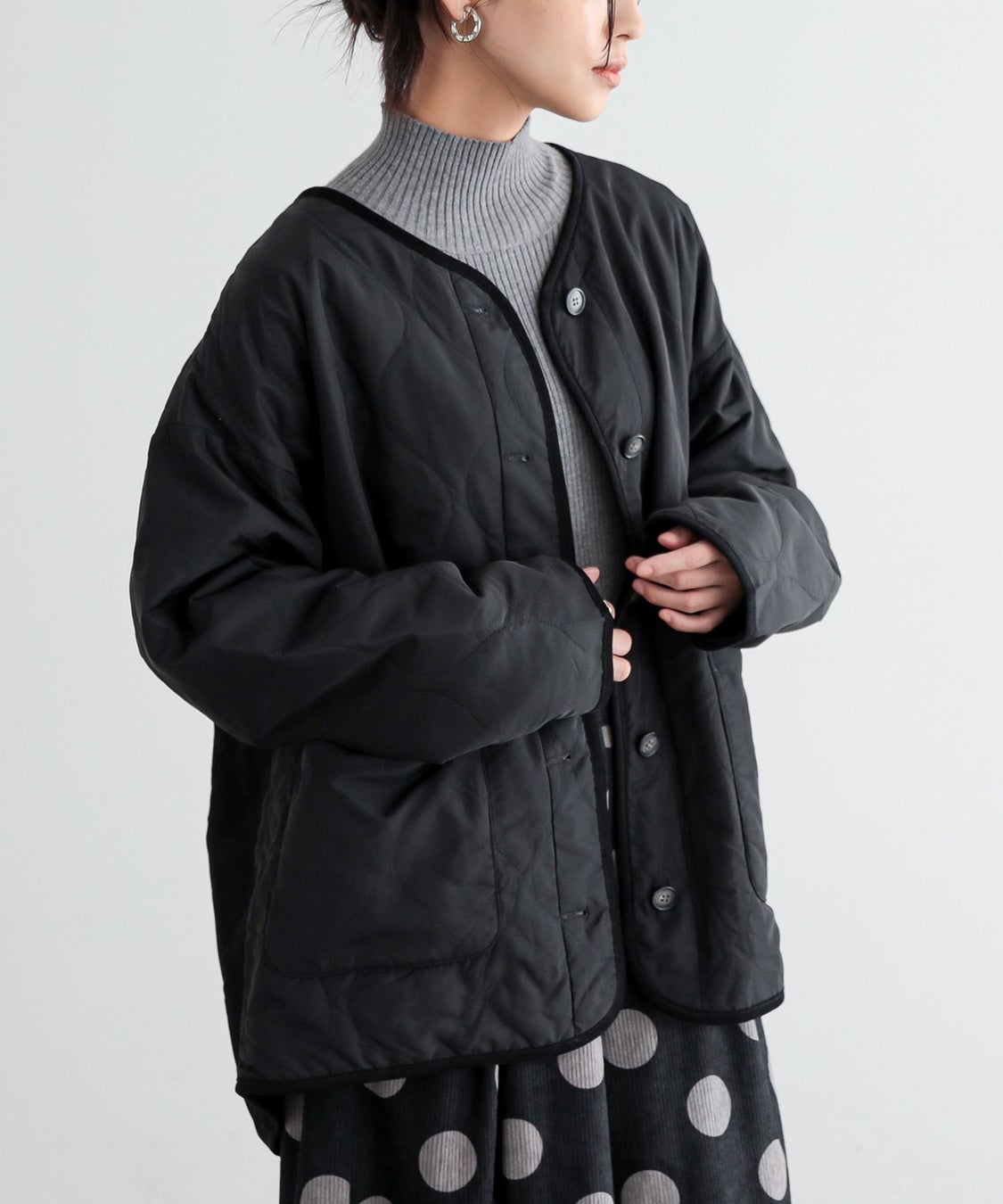 超軽量で撥水性のあるマットなキルティング生地を使用したアウター。程よい厚みの中綿入りで、身頃裏はフリースでしっかり暖かく、毎日手軽に着用できます。シンプルなノーカラーデザインでフードやマフラーとの着こなしも楽しめます。