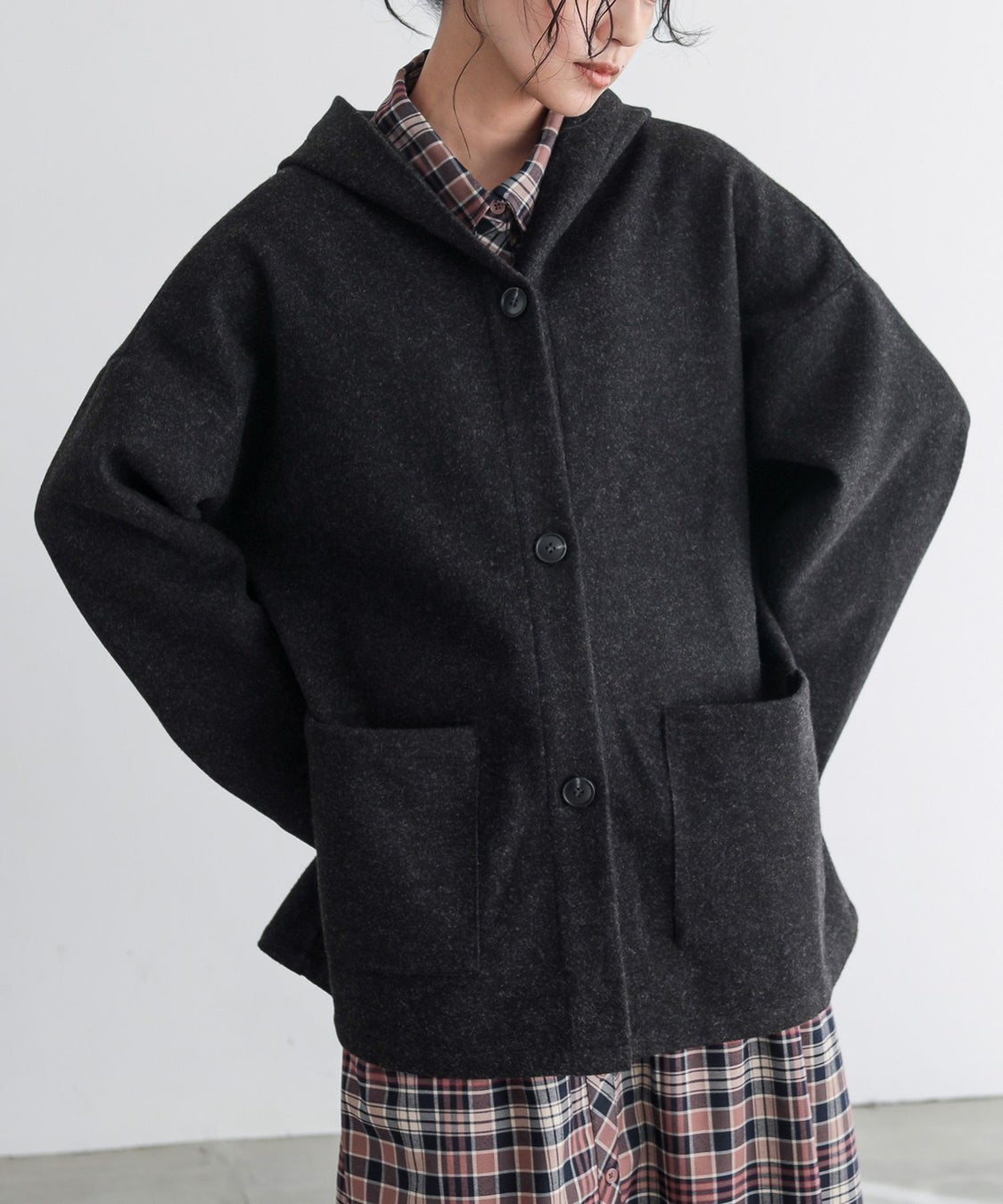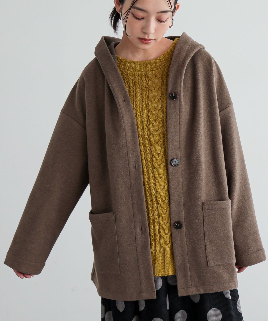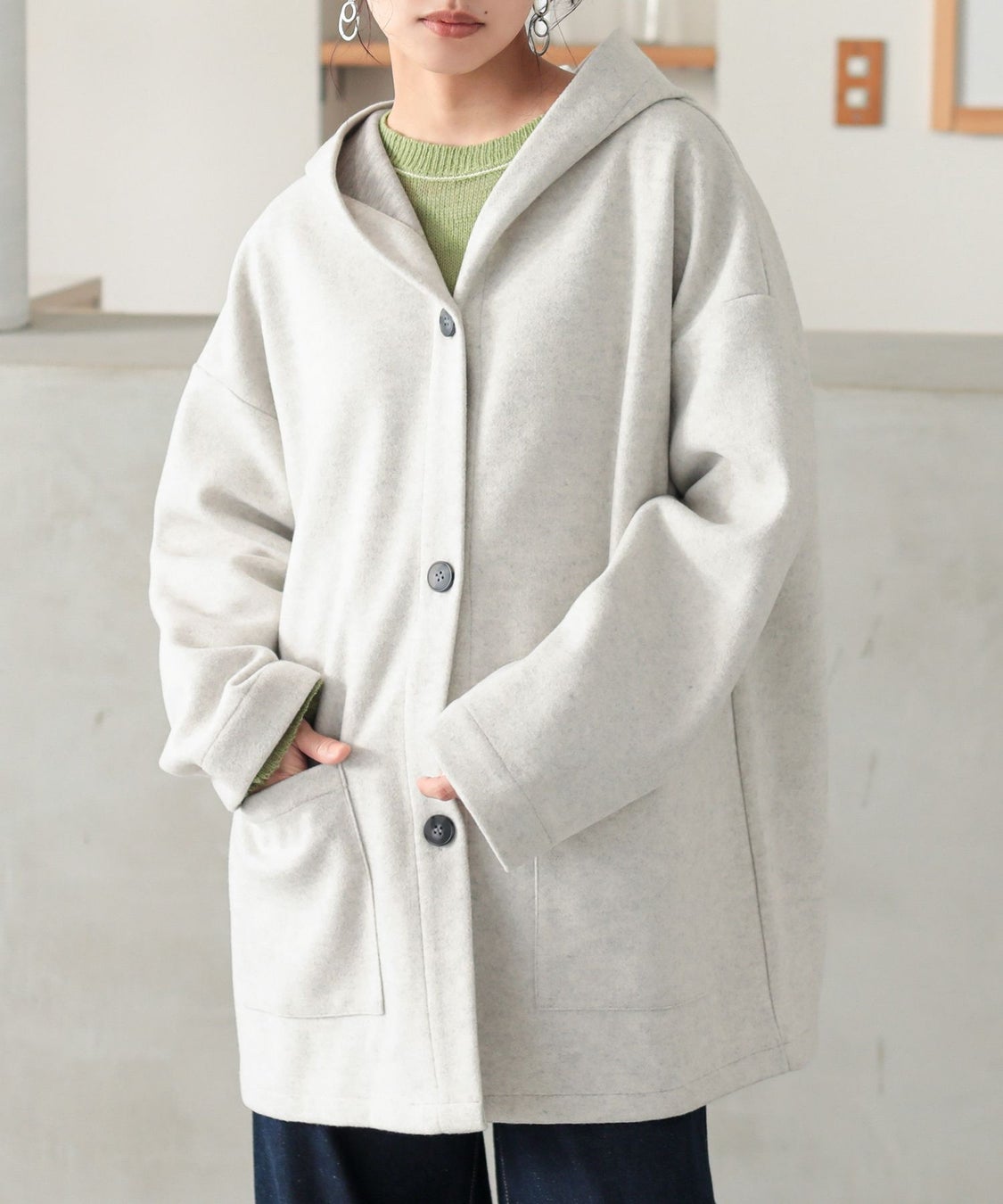 布帛のような起毛感のある上品な見た目ながらも、着心地の良いジャージー素材を使用したフード付きコート。お尻まで隠れる着丈で体型カバーも叶う一着です。柔らかく暖かいウールライクな素材のため、裏地無しでも着やすく丁度良い一枚です。