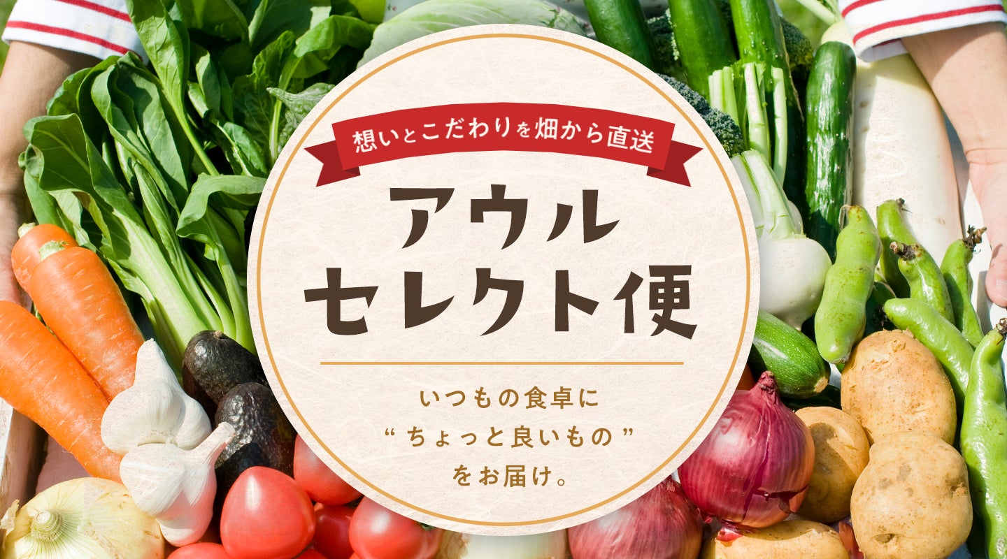 アウルセレクト便は産直ならではの旬の食材を産直アウルスタッフが厳選し、少しずつ詰合せてお届けする 1 人暮らしや 2 人暮らしの方に産直食材をお楽しみいただける新サービスです。 産直には興味があるけど、量が多くて食べきれないと思っていた方にお勧めです。