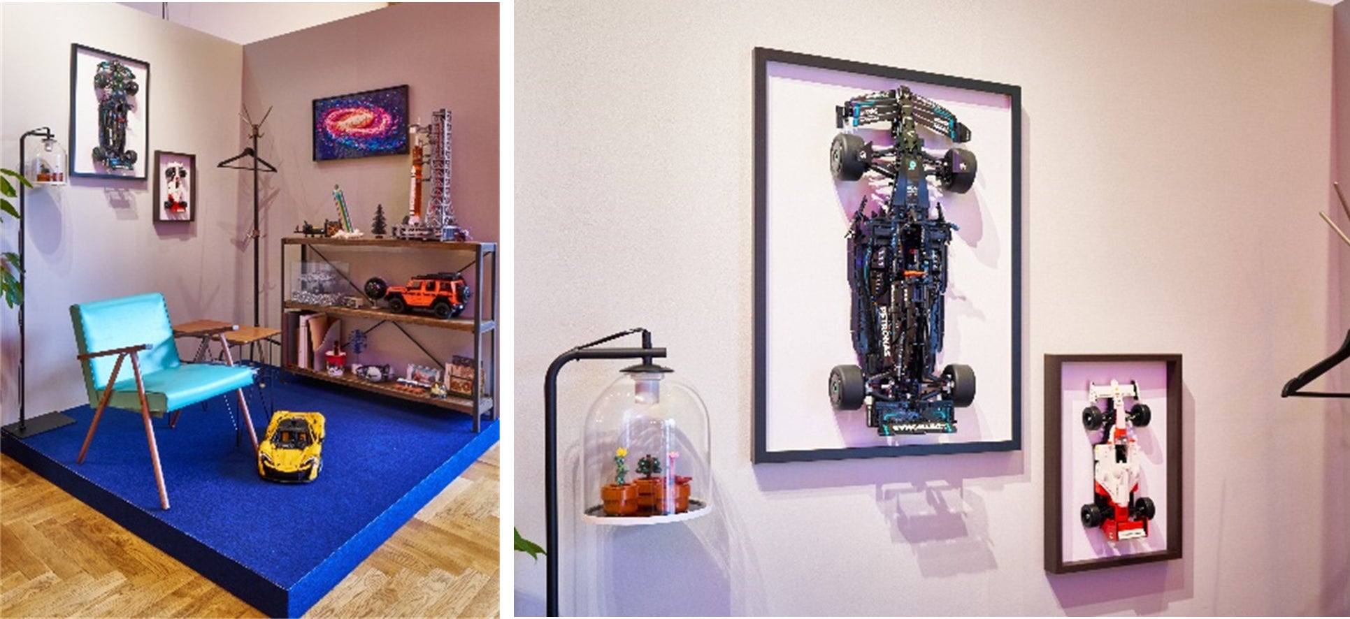 男性の部屋をイメージした空間では、本物さながらに再現された「レゴ®アイコン マクラーレン MP4/4 & アイルトン・セナ」や「レゴ®テクニック Mercedes-AMG F1 W14」を額縁に入れ壁にかけたり、床や棚に置くだけではない、部屋のアクセントになるようなディスプレイのアイディアを提案しました。