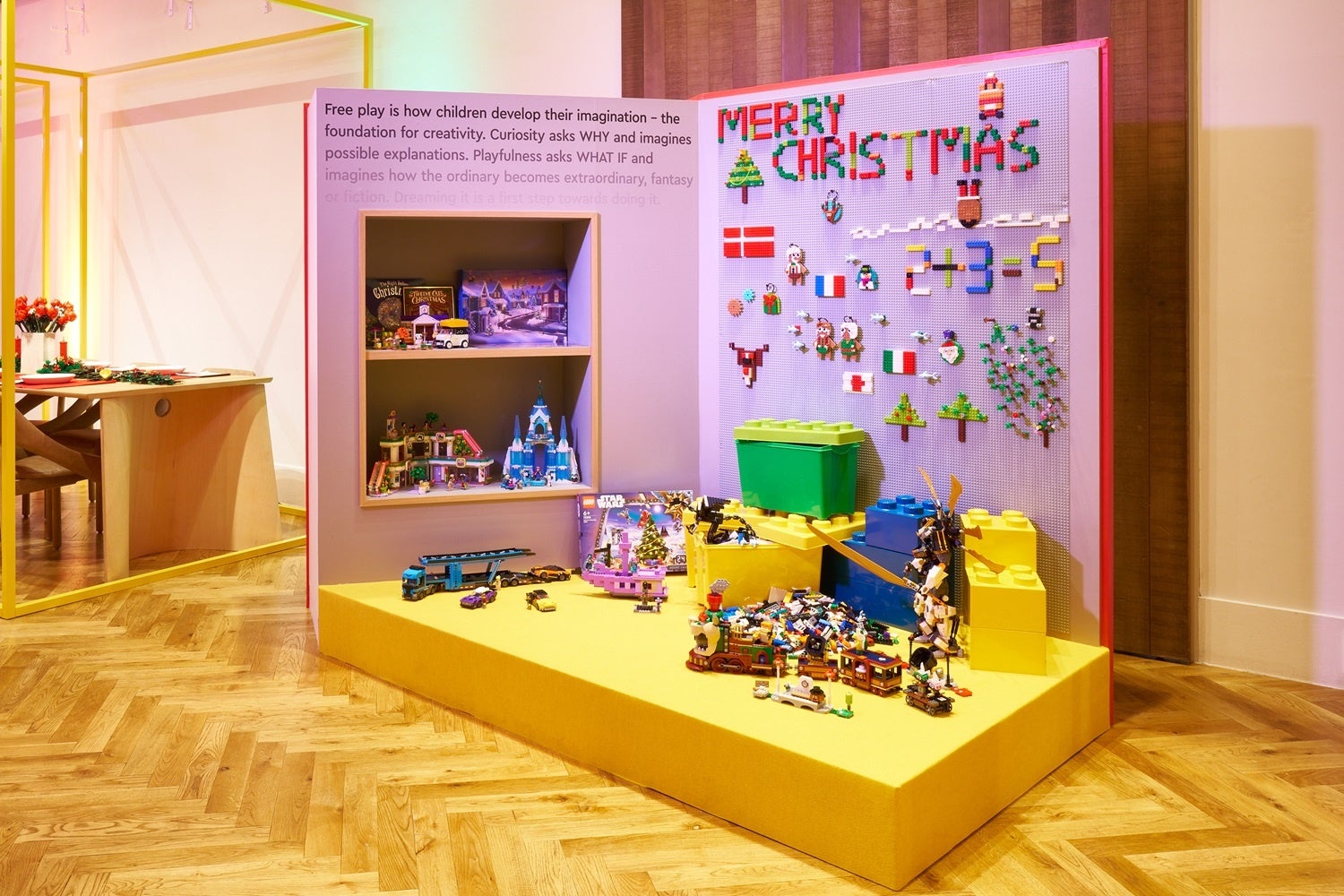 また、小さい本のエリアは、子ども部屋をイメージし、壁や床など部屋のいたるところにレゴ®ブロックが散りばめられ、まるで子どもたちが遊んでいるかのような空間のなか、お子さまへのクリスマスプレゼントにぴったりのアイテムを提案しました。