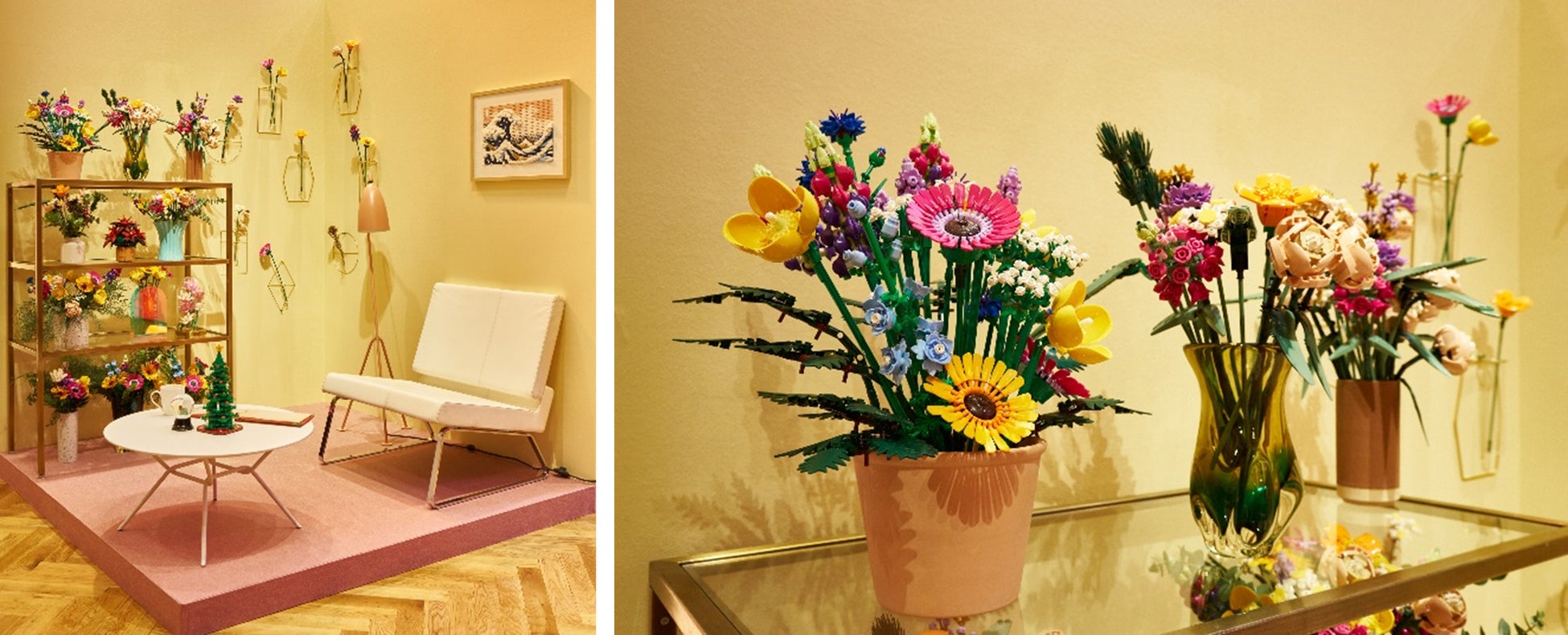 会場内には、女性、男性の部屋をイメージしたスタイリッシュな2つの空間も設置し、レゴ®製品をインテリアとして取り入れることを提案しました。女性の部屋をイメージした空間では、さまざまなフラワーベースに、「レゴ®フラワーブーケ」「レゴ®アイコン ワイルドフラワーブーケ」をはじめとする色鮮やかなレゴ®ボタニカルコレクションの製品を集め、その中では生花を組み合わせたり、壁掛けタイプの一輪挿しのフラワーベースにレゴ®製の花を一つずつ飾るアレンジなど、さまざまな飾り方のアイディア、レゴ®製品のアレンジの仕方を提案しました。