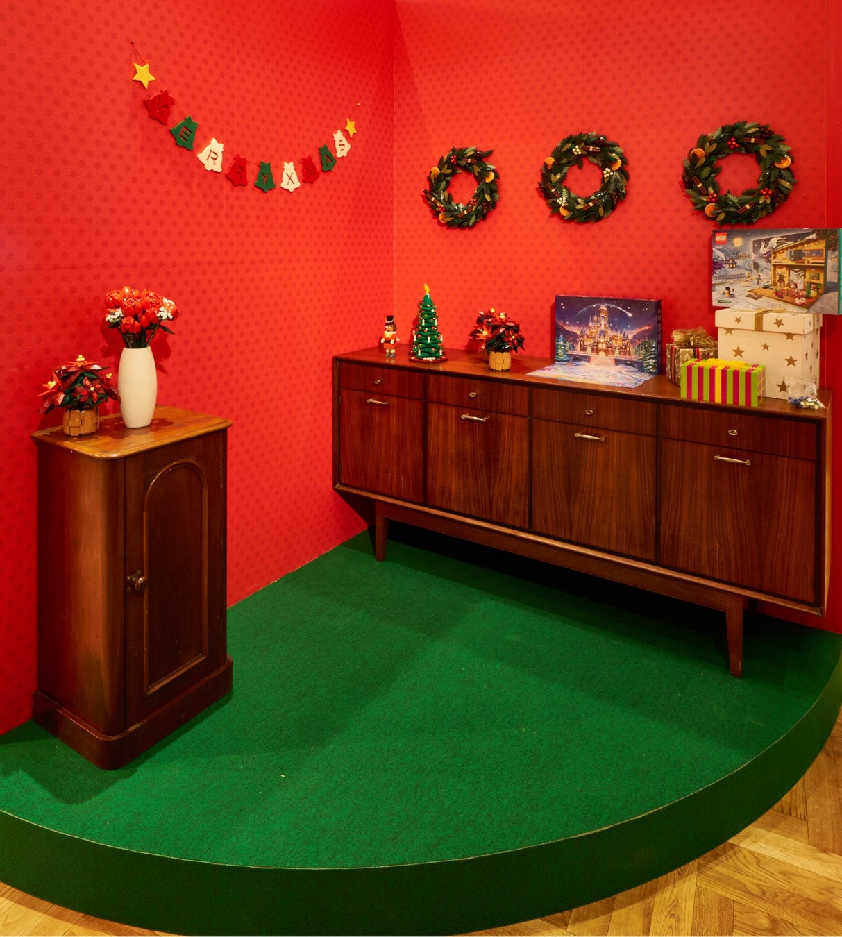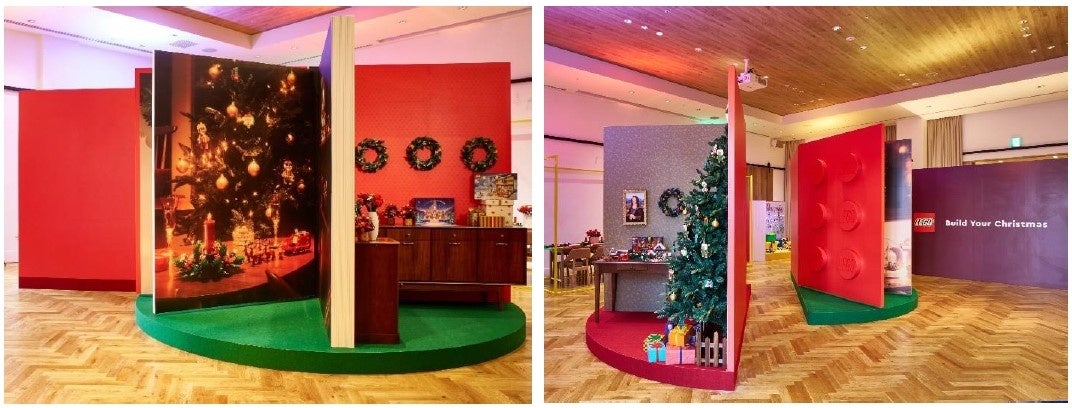 会場の中央には大きなインテリアブックが登場し、ページをめくるごとにさまざまなレゴ®製品をディスプレイしたインテリア空間、ホームデコレーションのアイディアが並びました。ページのひとつは、実際の家具が本から飛び出すような仕様になっており、シックな赤色の壁に「レゴ®ボタニカル クリスマスリース」や「レゴ®ボタニカル ポインセチア」などのホリデーシーズンにぴったりのアイテムがディスプレイされ、部屋を見るだけでクリスマス気分が盛り上がるようなインテリアを提案しました。