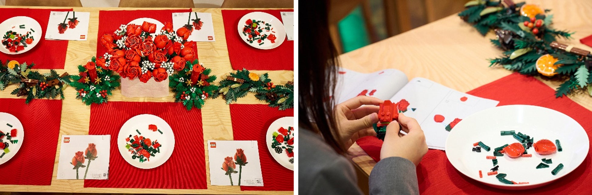 ビルディング体験エリアでは、来場者に「レゴ®アイコン バラのブーケ」の一輪を組み立てる体験を実施しました。「レゴ®クリスマス テーブルデコレーション」やガーランド仕様にした「レゴ®ボタニカル クリスマスリース」でテーブルデコレーションされたクリスマスディナーのような雰囲気のなか、実際に体験した来場者からは、「久しぶりにレゴ®ブロックを組み立てたけど楽しかった!」「いつもは子どもが組み立てているのを見ているだけだったけど、自分で体験してみると簡単でかわいい」などの声が上がり、来場者も思わず時間を忘れ、夢中になって組み立てに没頭する様子が見られました。
