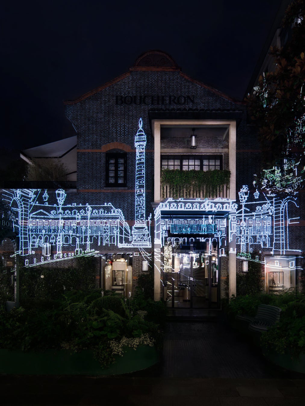 「ブシュロン 新天地本店」のブティックは、19世紀の 石庫門(シクーメン)建築を尊重しながら修復した建物を活かし、アールデコのデザインコード──シンメトリー、メタリックのアクセント、エメラルドカットのモチーフ──を随所に取り入れています。こうした要素が上海特有の建築様式と調和し、メゾンらしい優美な世界観を描き出します。ブティックの内外には自然の息吹が随所に宿り、都市の中心にありながら、訪れる人を静かな思索へ誘います。入口では、パリ本店の「ジャルダン・ディヴェール(冬の庭園)」を現代的に解釈したガゼボが迎え、別の入口では中国の古典庭園に着想を得た 月亮門(ムーンゲート) が、次の世界へと移ろう象徴として佇みます。