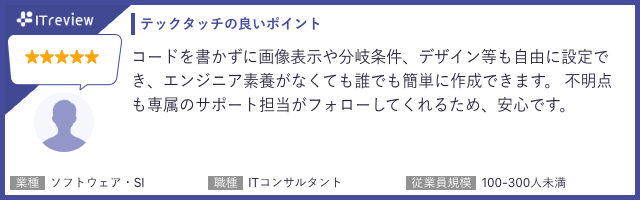 ・コードを書かずに画像表示や分岐条件、デザイン等も自由に設定でき、エンジニア素養がなくても誰でも簡単に作成できる