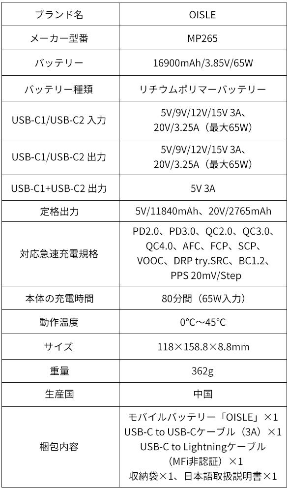 8.8mm極薄モバイルバッテリー「OISLE」65W急速充電・16900mAh大容量・パソコンの急速充電にも対応可能!