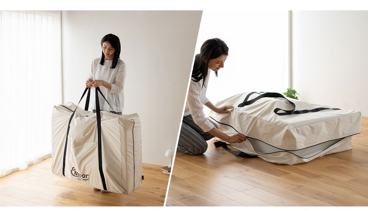 寝具をすっきりまとめて持ち運べる、オールインワン設計。収納用としてだけでなく、引っ越しや移動の際にも活躍します。丈夫で持ちやすく、収納時も汚れを防ぎます。車に積んで持ち運んだり、収納時もコンパクトに収まります。