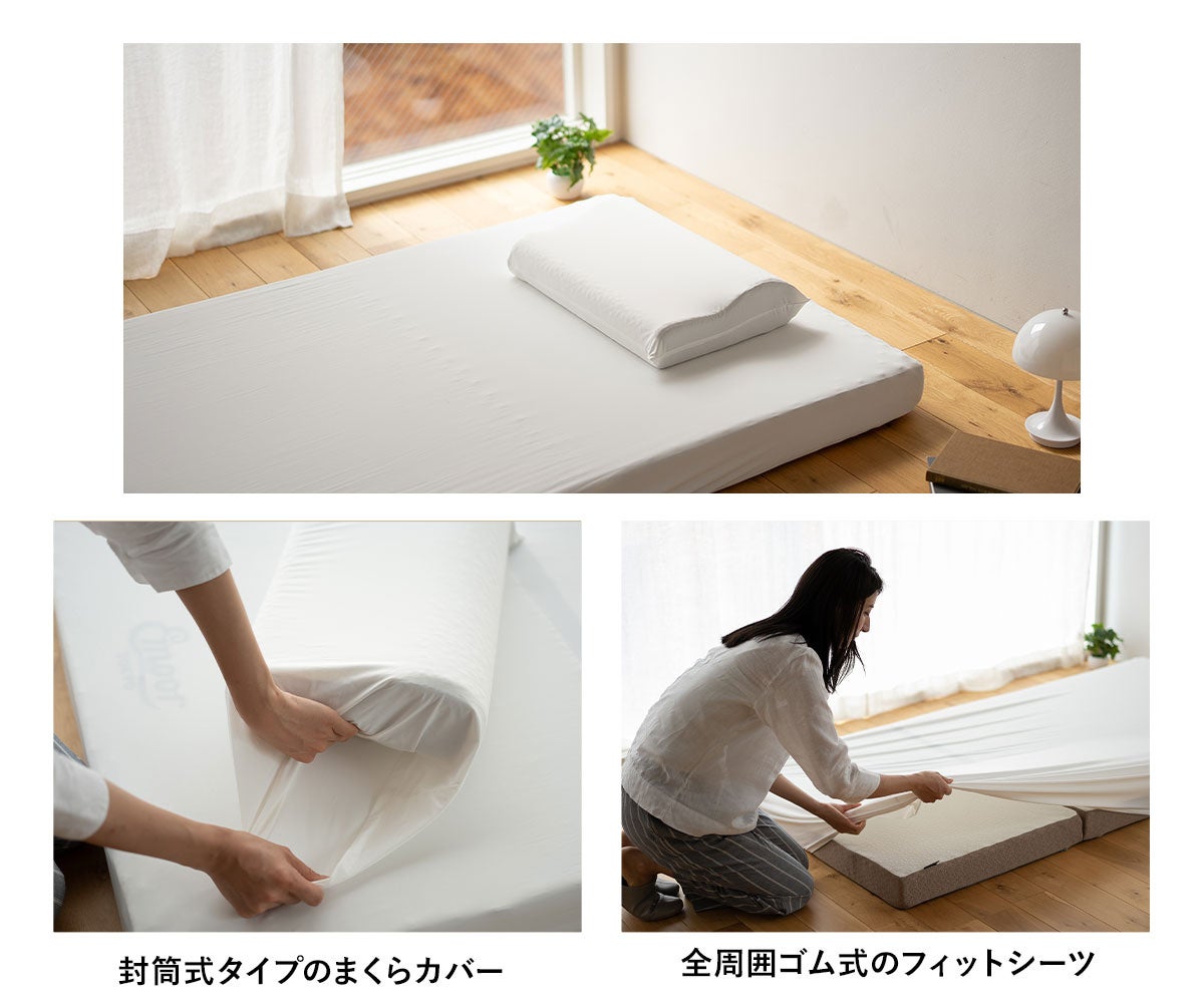 まくらカバーとフィットシーツがそれぞれ2セット付き。洗い替え分があることで、汗をかきやすい季節や忙しい日でも、いつでも清潔に使えるのが魅力です。シーツやカバーをローテーションすれば、快適な寝心地を保ちながら手軽にお手入れでき、マットレスやまくらの寿命も延びます。また、伸縮性のある素材を使い、着脱の手間となるファスナーなどは付けていません。忙しい現代人のための実践的な設計です。