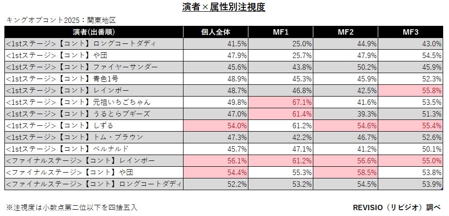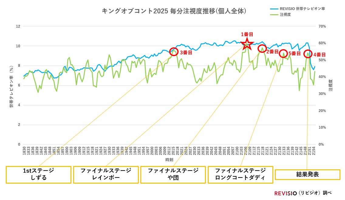 ご家庭に人体認識技術を搭載した機器を設置し、テレビスクリーンの「アテンション(注視)」を測るREVISIO株式会社(所在地 :東京都千代田区、代表取締役社長 郡谷 康士、以下REVISIO)は、 2025年10月11日(土)にTBS系列で放送された「キングオブコント2025」について、どのシーンが一番視られていたのか、視聴質データを使った分析を公開いたしました。