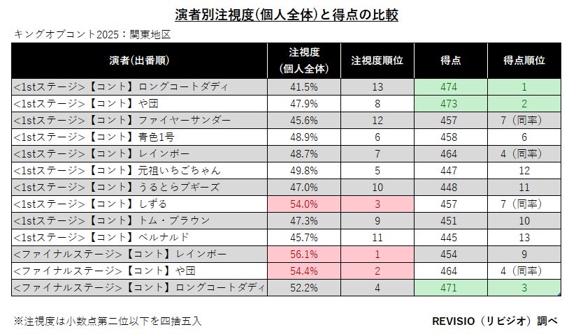 審査員による採点は、ネタの新鮮さや構成、オリジナリティなどでつけられるものであり、その道のプロフェッショナルである審査員の腕の見せ所です。一方、注視度にはキャッチーさや動きで視聴者をくぎづけにするといった「外見的な要素」が大きく影響します。実際の採点は、技術的な構成力や完成度も加味して評価されていることが賞レースの面白さなのでしょう。