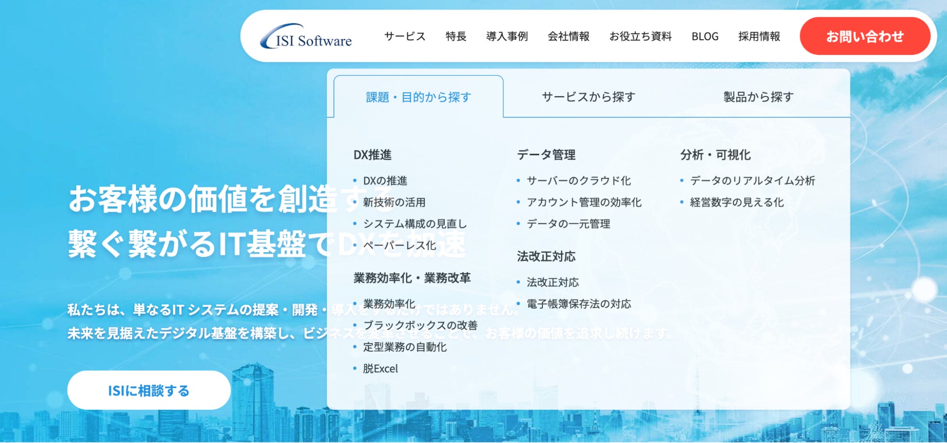ISIソフトウェアーは、IT製品の導入から運用までを一貫して支援するITソリューション企業です。個別製品の販売ではなく、顧客の業務課題に合わせた最適な組み合わせを提案・実行する「提案型支援」を強みとしています。