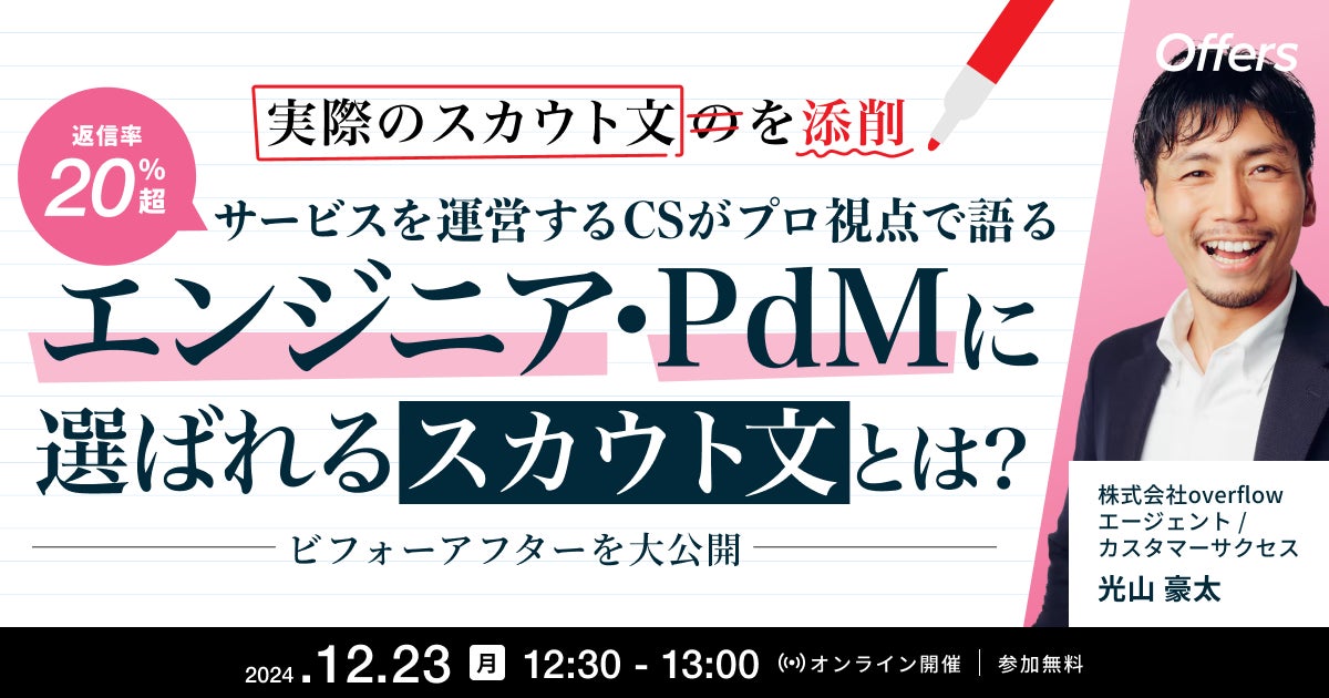 12/23(月) 12:30〜|実際のスカウト文を添削!返信率20%超サービスを運営するCSがプロ視点で語るエンジニア・PdMに選ばれるスカウト文とは? 〜ビフォーアフターを大公開〜