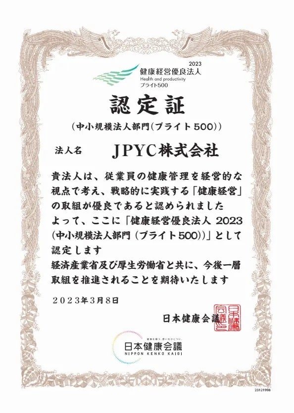 JPYC社は2022年6月に人的資本の情報開示を行い、2023年3月には「健康経営優良法人2023(中小規模法人部門(ブライト500))」に認定されています。