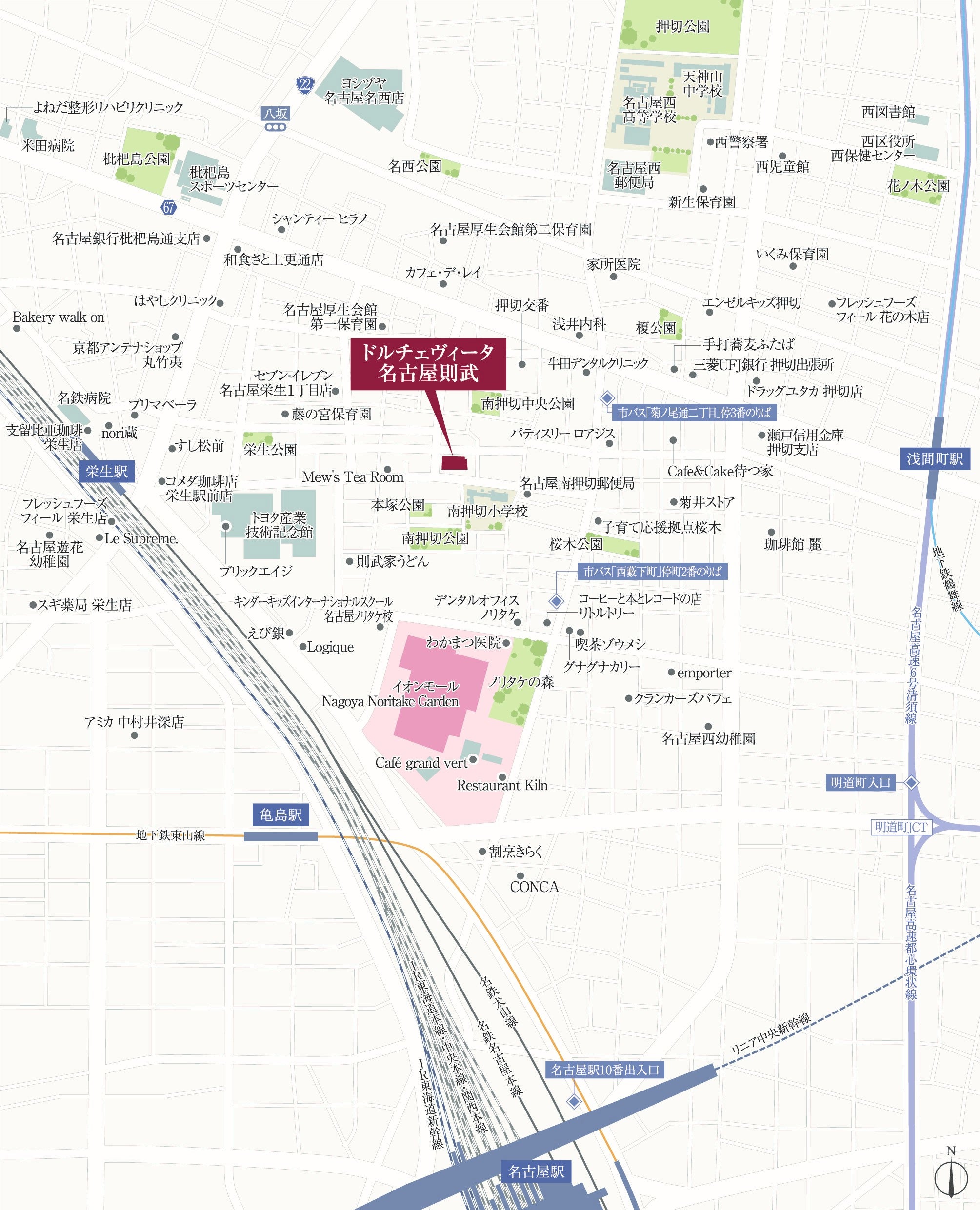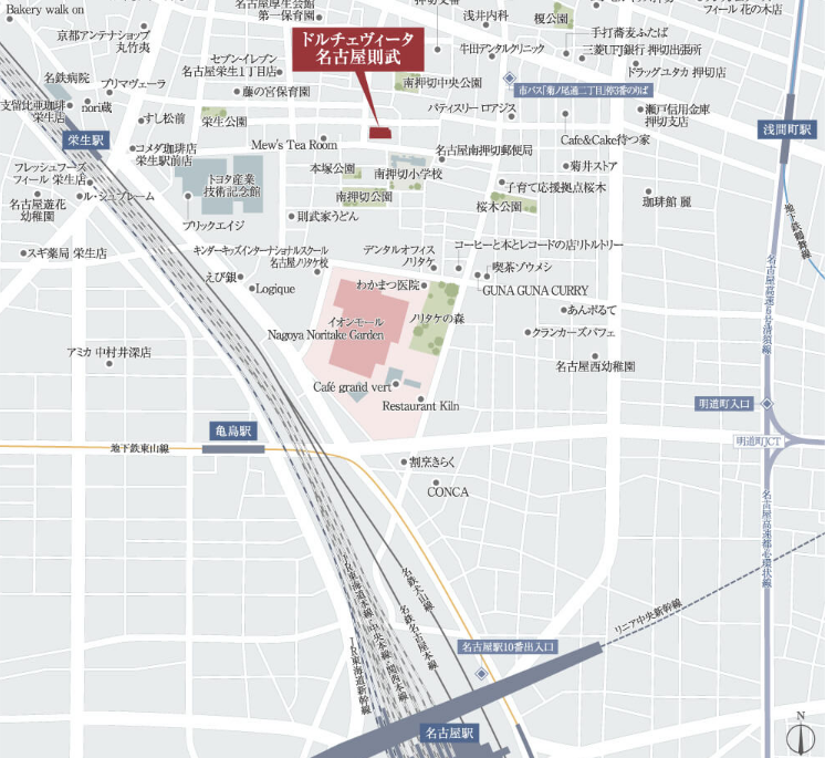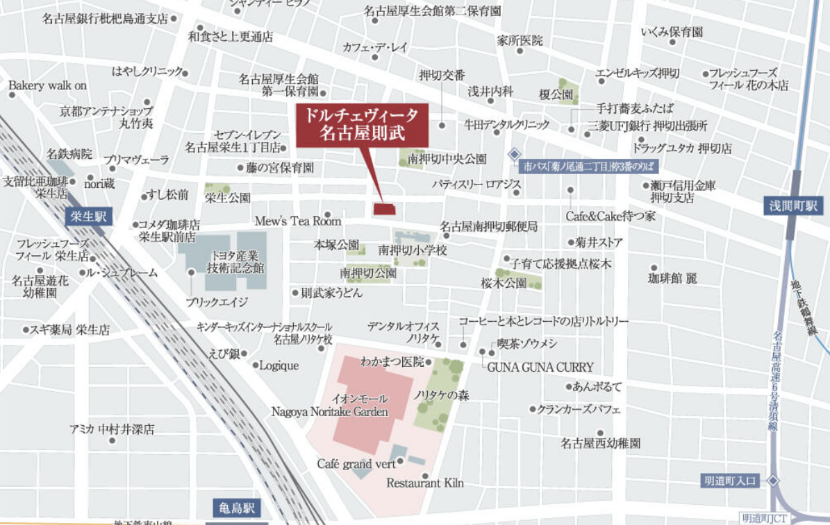 本物件から徒歩10分圏内には、2021年に開業した約150店舗の専門店やクリニックなどを有する大型商業施設「イオンモール Nagoya Noritake Garden」(徒歩8分/約600m)や、ミュージアムや自然豊かな公園を有する約3,4ha(34,000㎡)の「ノリタケの森」があり、都心でありながらも、身近に自然を感じることができる閑静な住環境が広がっています。