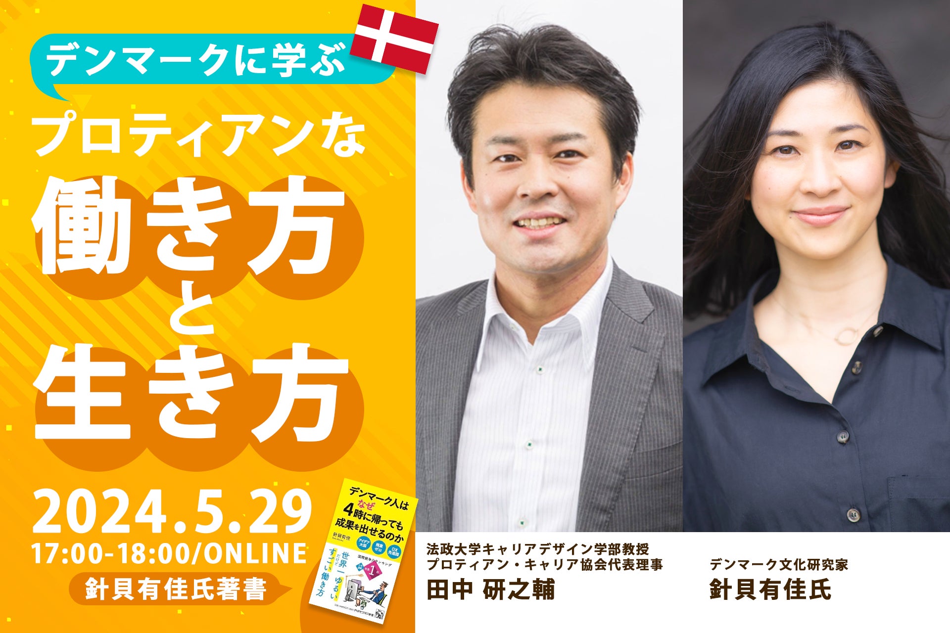 「デンマーク人はなぜ4時に帰っても成果を出せるのか」の著者、針貝有佳氏をお招きして、一般社団法人プロティアン・キャリア協会代表理事田中研之輔との対談形式でプロティアンな働き方と生き方について考えていきます。