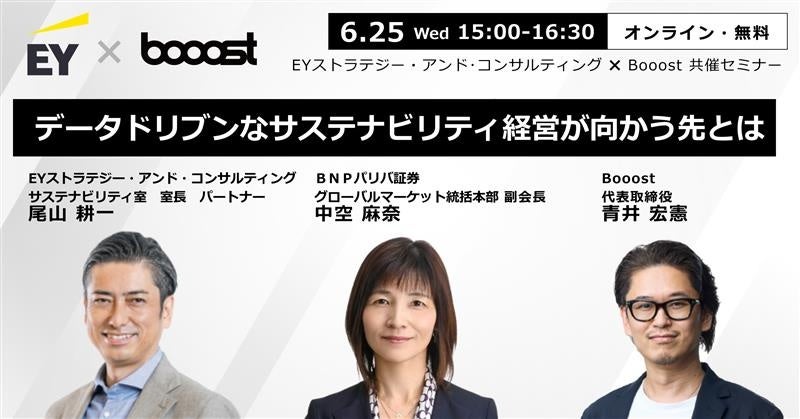 統合型SXプラットフォーム「サステナビリティERP(※1)」の提供を通じて、企業のサステナビリティ・トランスフォーメーション(SX)を支援するBooost株式会社(本社:東京都品川区、代表取締役:青井宏憲、以下 当社)は、EYストラテジー・アンド・コンサルティング株式会社(本社:東京都千代田区、代表取締役社長:近藤聡)と共催で、2025年6月25日(水)15:00より、無料オンラインセミナーを開催いたします。「データドリブンなサステナビリティ経営が向かう先とは」と題し、サステナビリティ情報開示義務化を契機とした、社会課題解決および企業価値向上の加速について深掘りします。