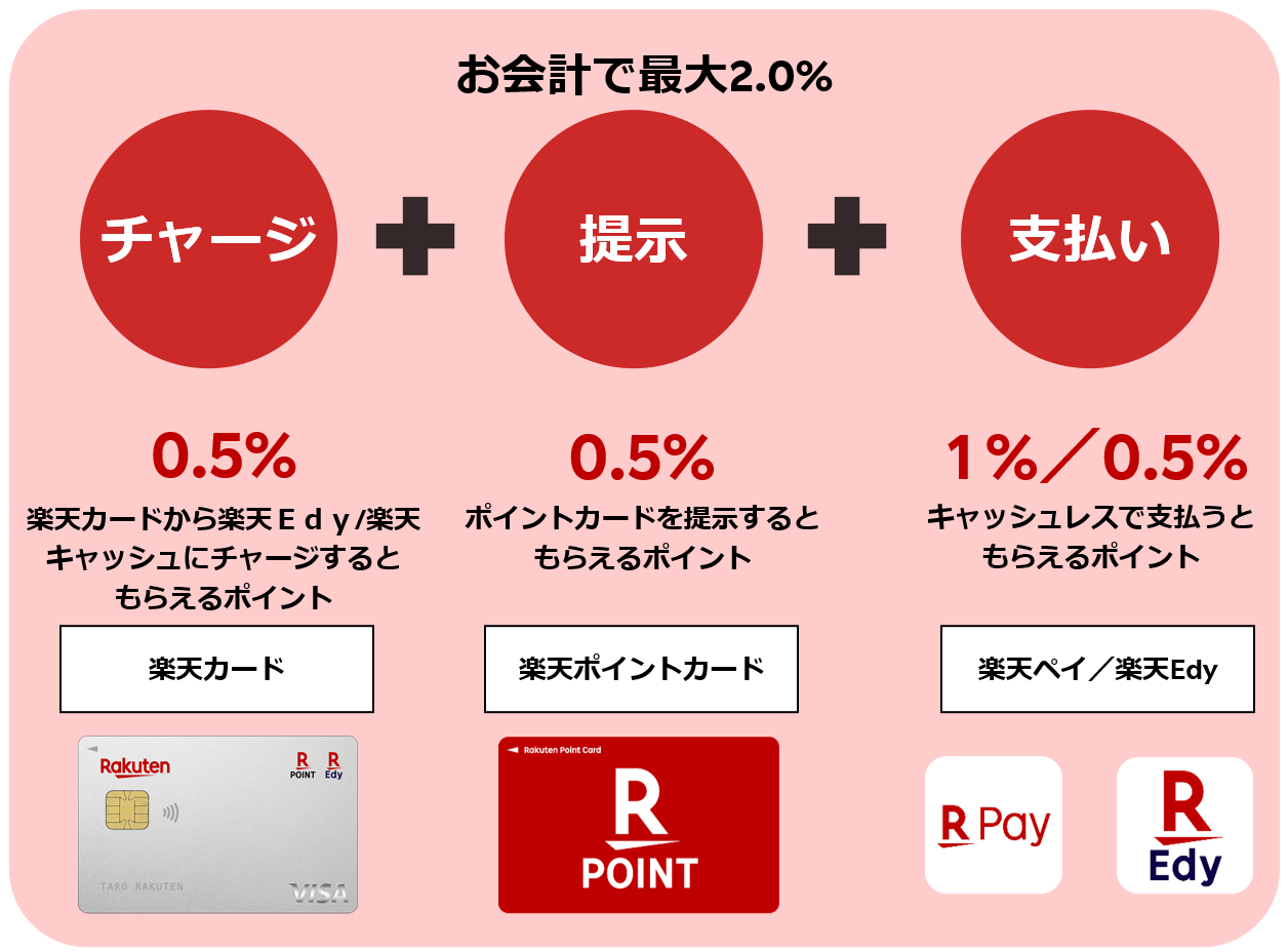・概要: 対象店舗にて、会計時に「楽天ポイントカード」もしくは「楽天ポイントカード」機能の搭載されたアプリを提示すると、「楽天ポイント」を進呈します。また会計時に「楽天ポイント」を使用することができます。