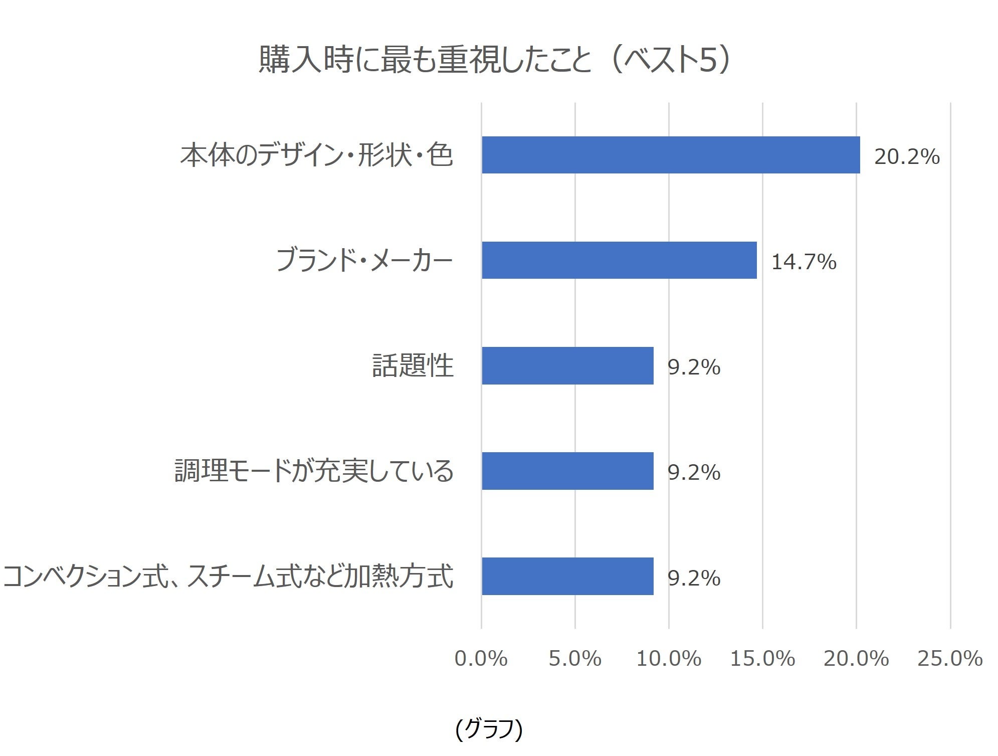 高額トースターを購入する際に最も重視したポイントは、「本体のデザイン・形状・色」が20.2%と最も多く、「ブランド・メーカー」「話題性」などが続く結果に(グラフ)。
