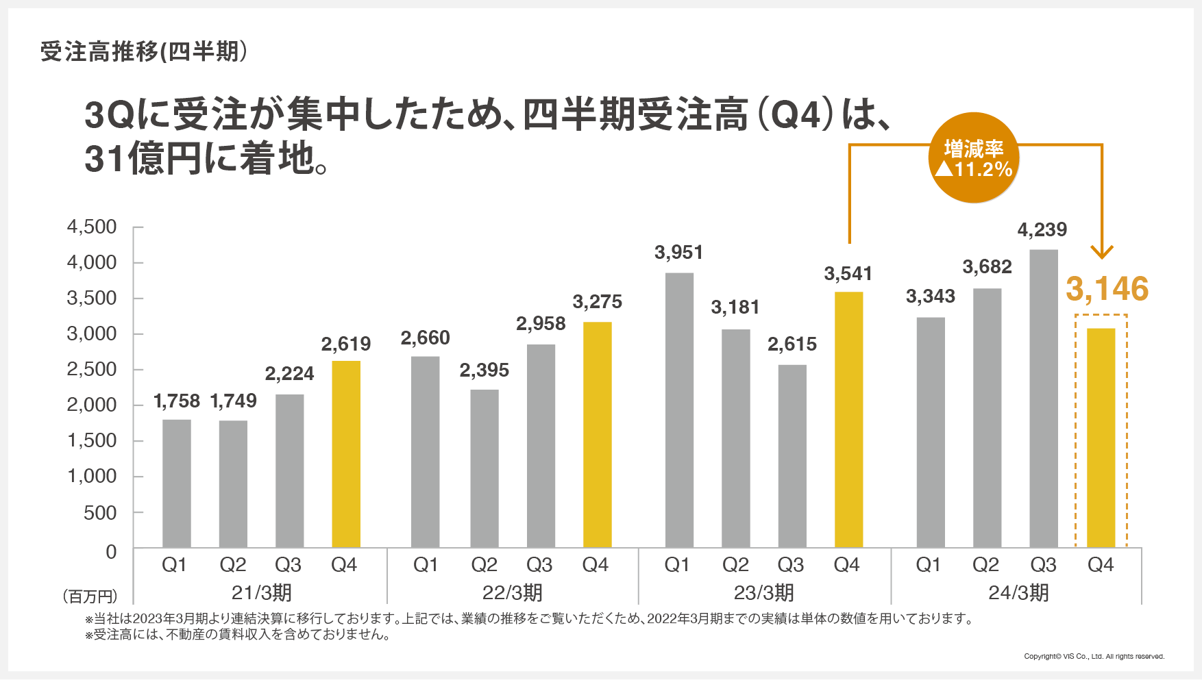第4四半期の受注高は、第3四半期に受注が集中した影響で、31億円に着地しました。