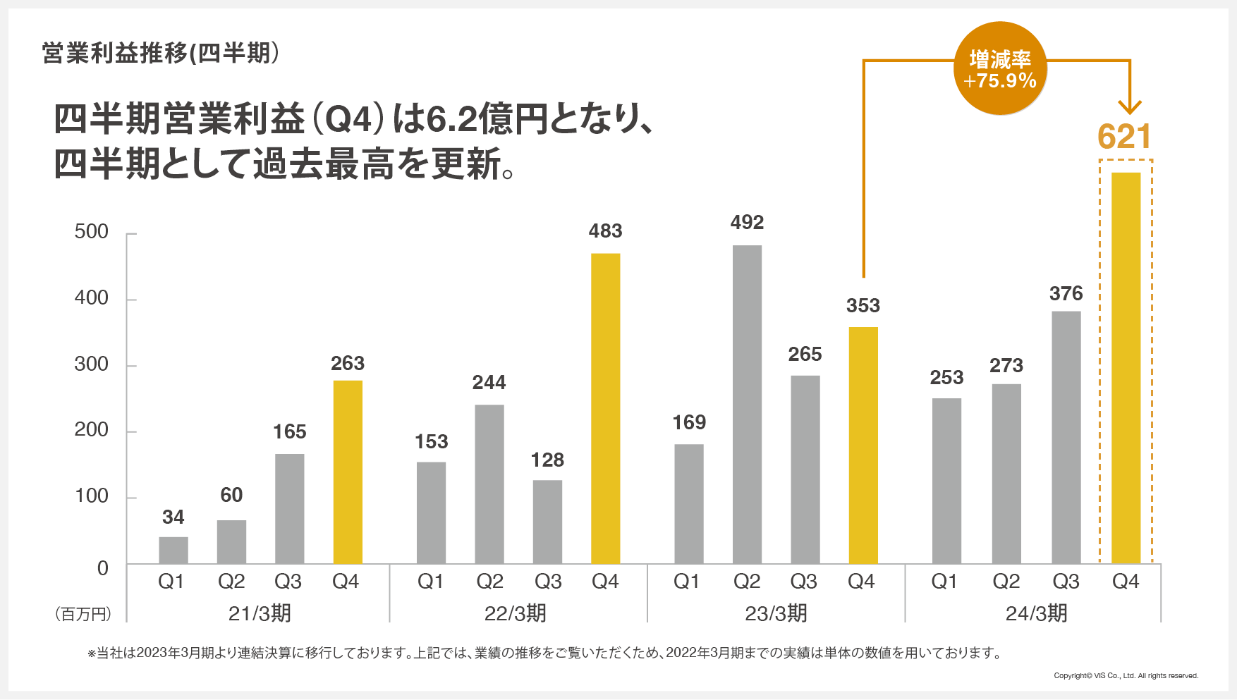 第4四半期の営業利益は6.2億円となり、第4四半期として過去最高を更新しました。