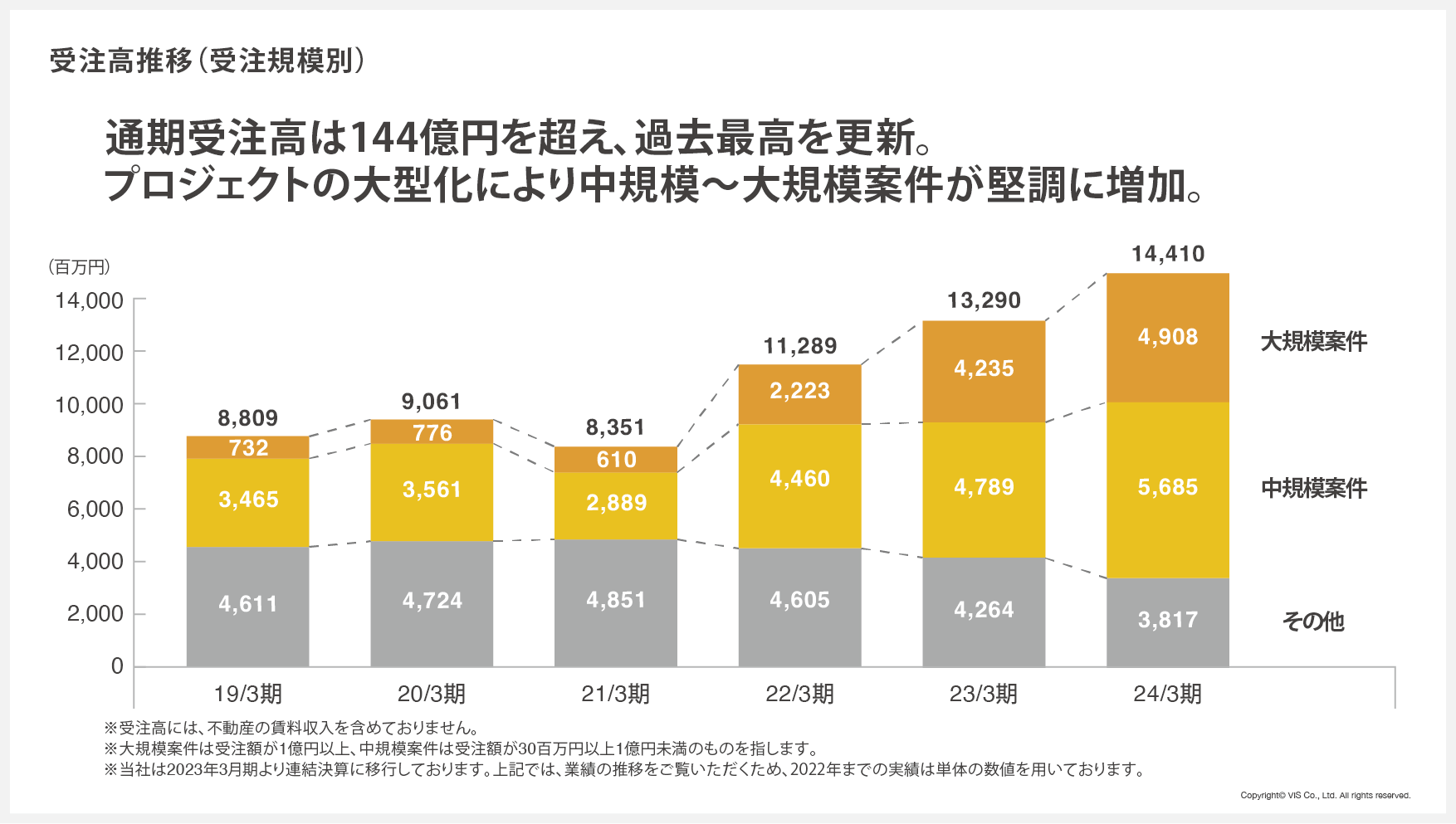通期受注高はプロジェクトの大型化により中規模~大規模案件が堅調に増加し、144億円を超えました。