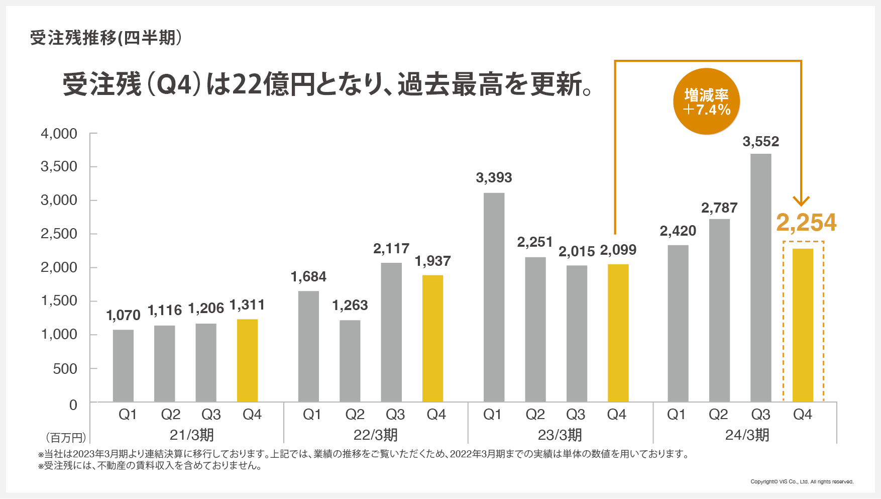 第4四半期の受注残は22億円となり、四半期として過去最高を更新しました。