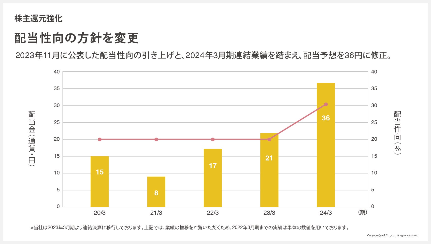 2023年11月に公表した配当性向の引き上げと、2024年3月期連結業績を踏まえ、配当予想を36円に修正しました。