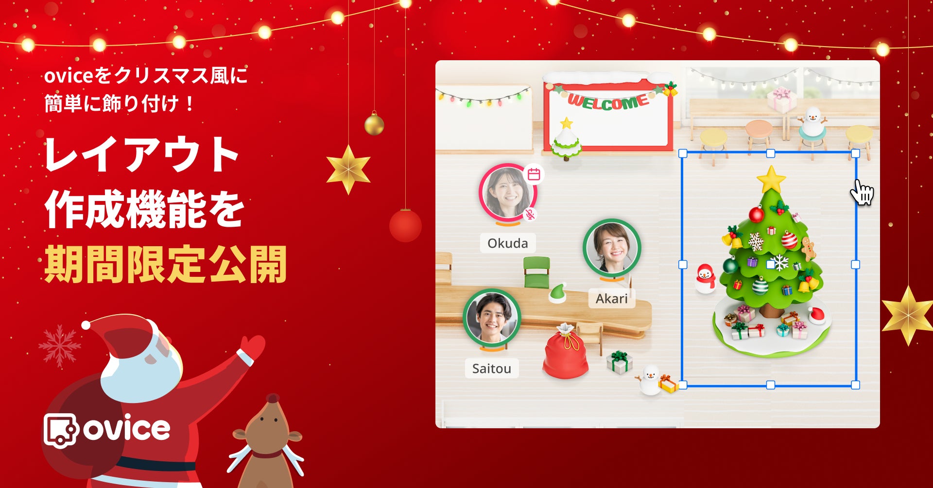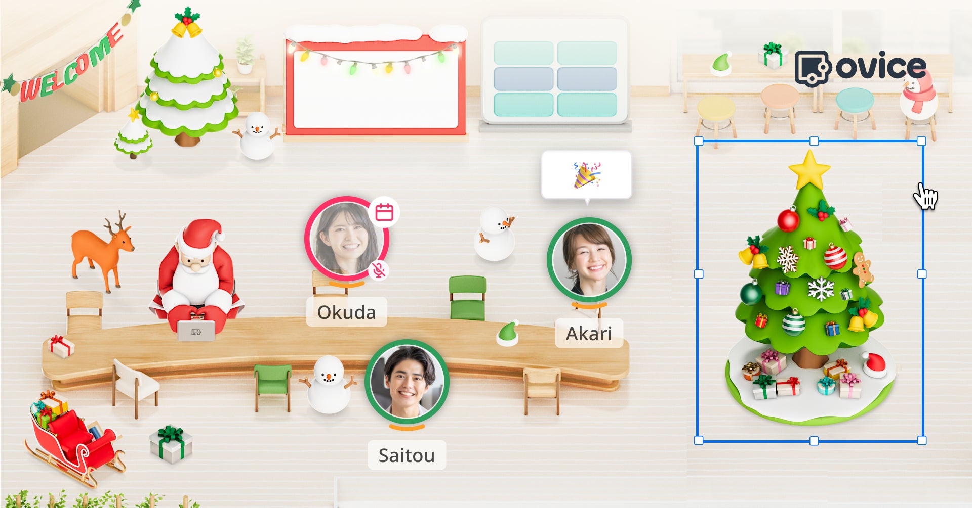 本機能はクリスマス時期限定の提供となりますが、さらなる機能改良とオフィスの日常を彩るアイテムを加え、正式版として後日公開する予定です。この機会にお試しいただき、ovice上でクリスマスの雰囲気をお楽しみください。