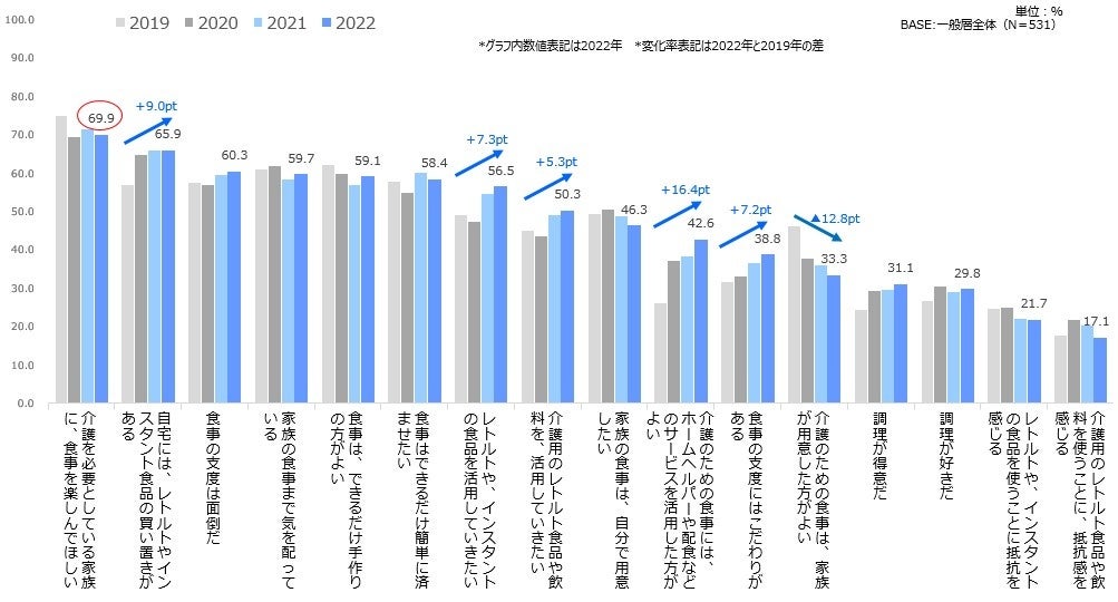 「介護における食と調理意識」を調査したところ、「食事を楽しんでほしい」と回答した方は昨年に比べ微減となっているものの全体の約7割と、他の回答よりも高い結果となりました。「介護用のレトルト食品や飲料を、活用していきたい」という方は増加傾向で、2019年比で5.3ポイント増の50.3%となりました。