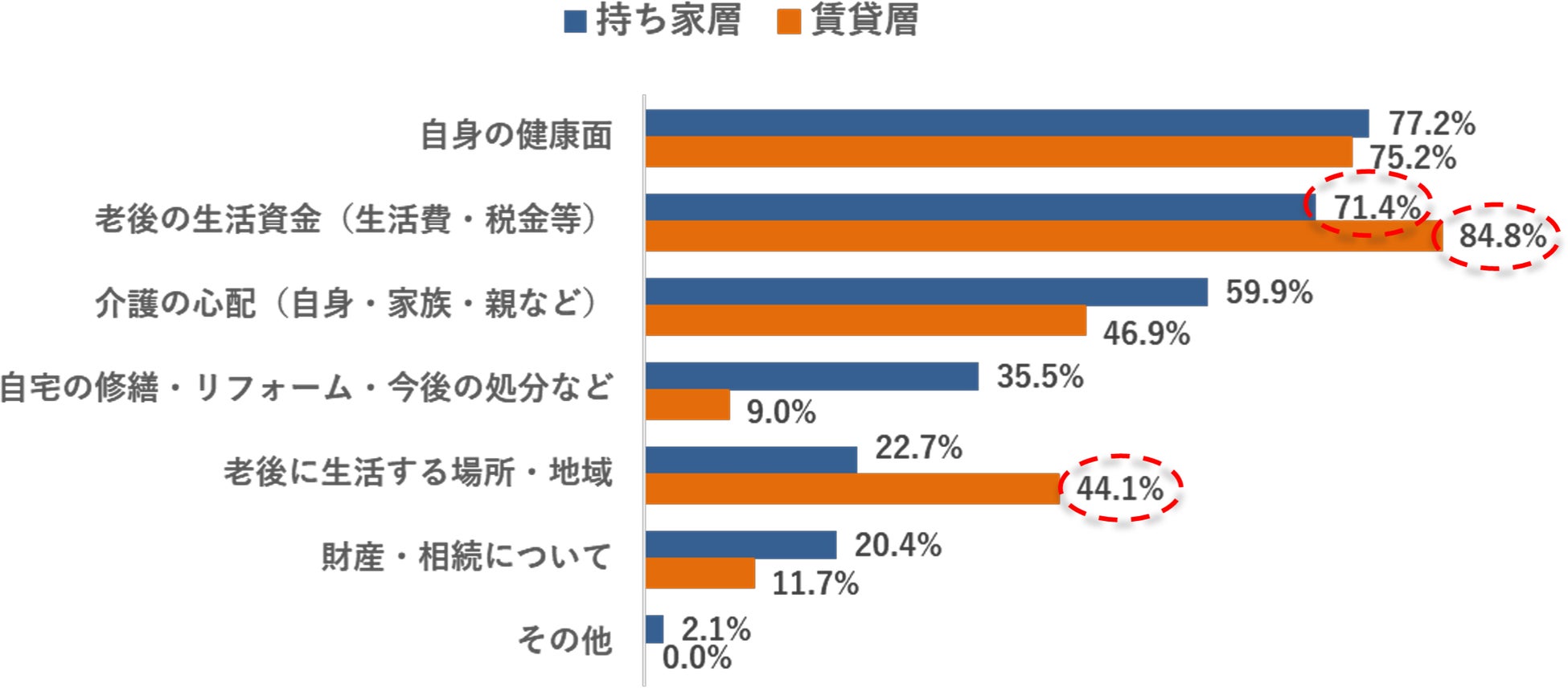 老後について「不安を感じる」「少し不安を感じる」と回答した人に、どのようなことに不安を感じるか聞いたところ、「自身の健康面」「老後の生活資金」「介護の心配」が上位を占めました。持ち家層では「自身の健康面」の不安が1位で77.2%、2位に「老後の生活資金」の不安で71.4%の方が回答しています。賃貸層では「老後の生活資金」の不安が1位で84.8%の方が回答、また44.1%の方が「老後に生活する場所・地域」と回答しており、賃貸層ならではの不安も浮き彫りになっています。