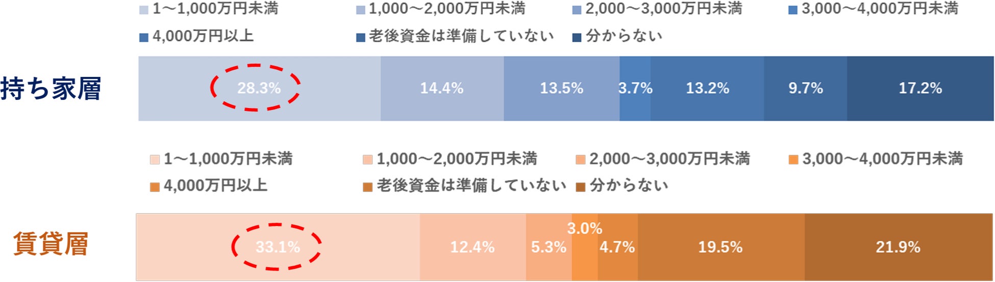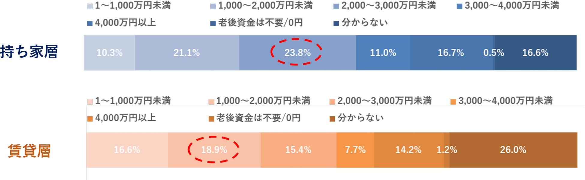 →老後資金の理想額、持ち家層は2,000万円台、賃貸層は1,000万円台が最多