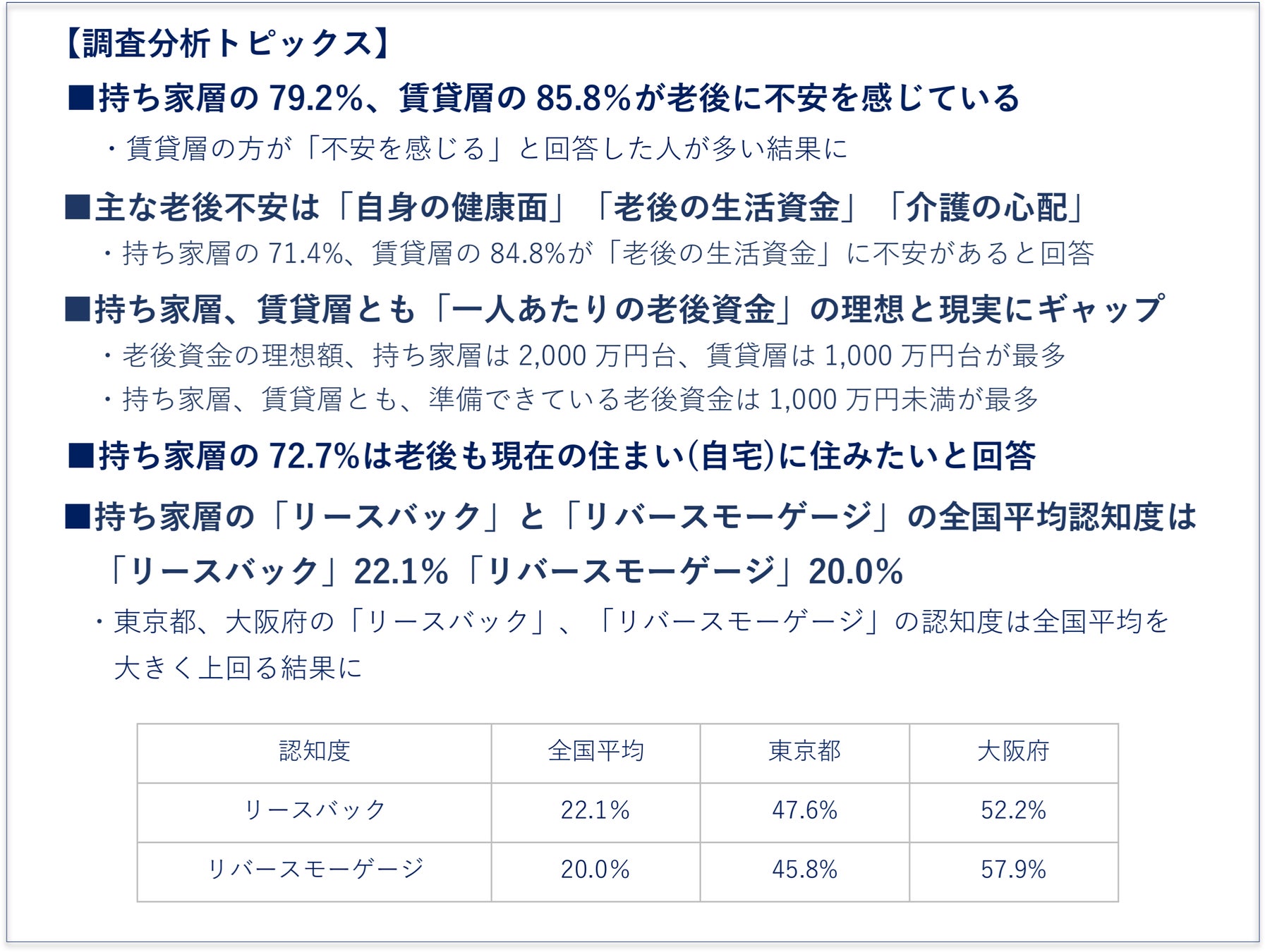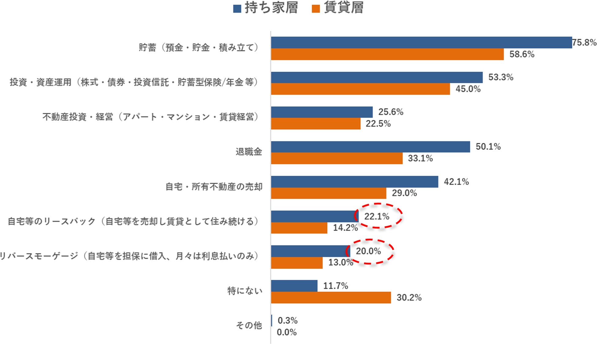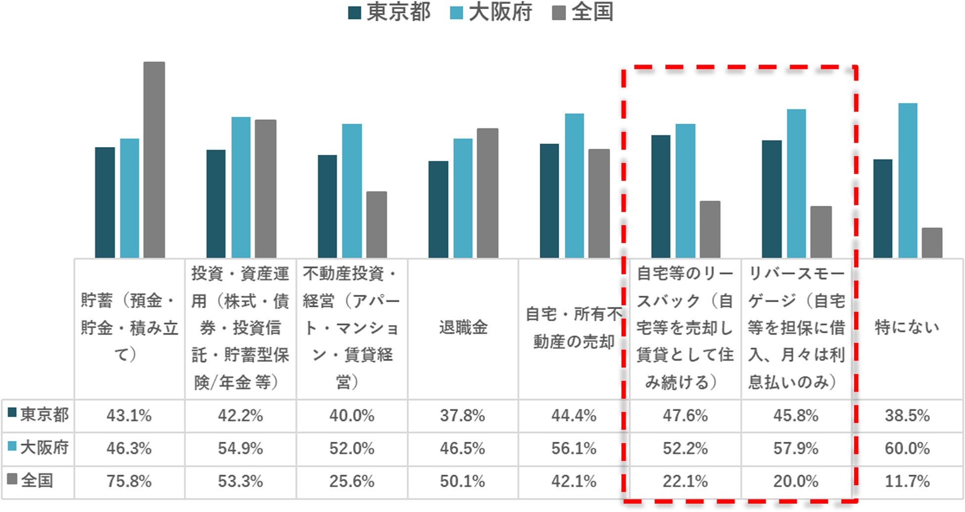 持ち家層の「老後資金対策(老後資金づくり)」としての全国平均の認知度は、「貯蓄」75.8%、「投資・資産運用」53.3%、「退職金」50.1%が大きな割合を占めています。自宅を活用した老後資金対策として、自宅を売却後も賃貸で住み続けられる「リースバック」と自宅を担保に月々支払いは利息のみの「リバースモーゲージ」がありますが、認知度は「リースバック」22.1%、「リバースモーゲージ」20.0%となっています。
